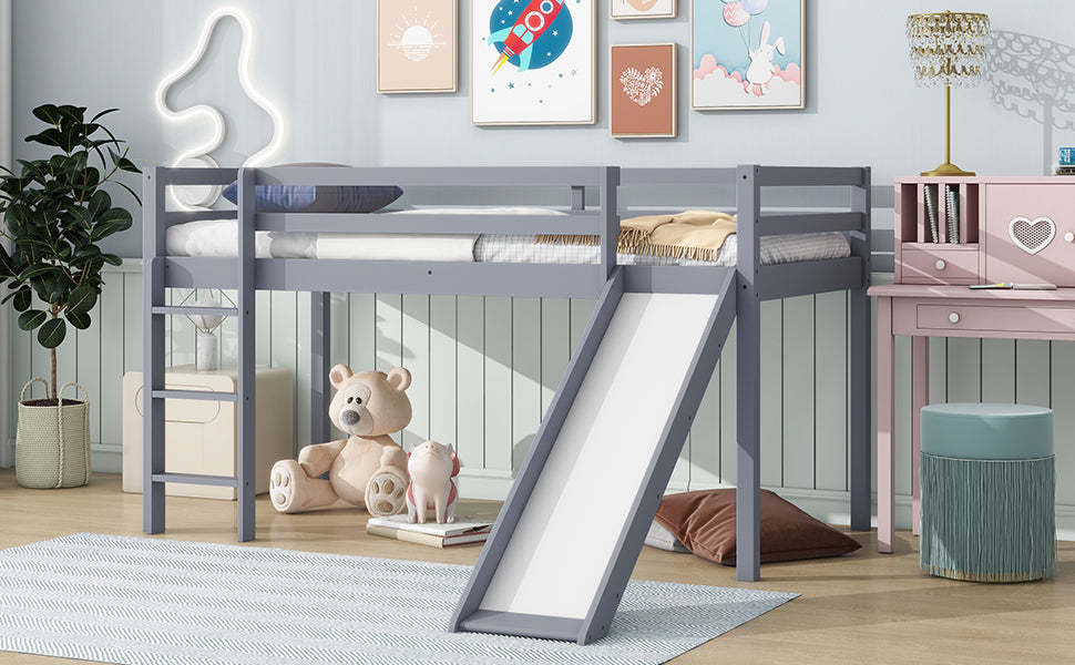 Twin Low Loft Bed with Slide & Ladder, Grey Rubber Wood, Safety Rails