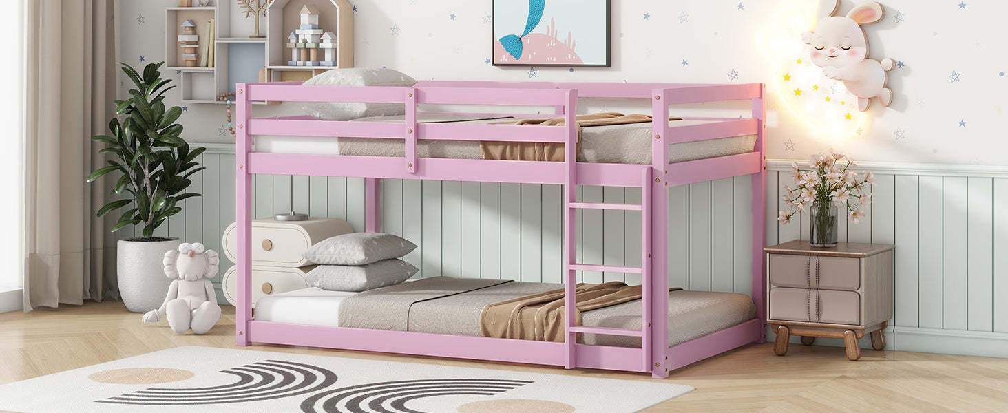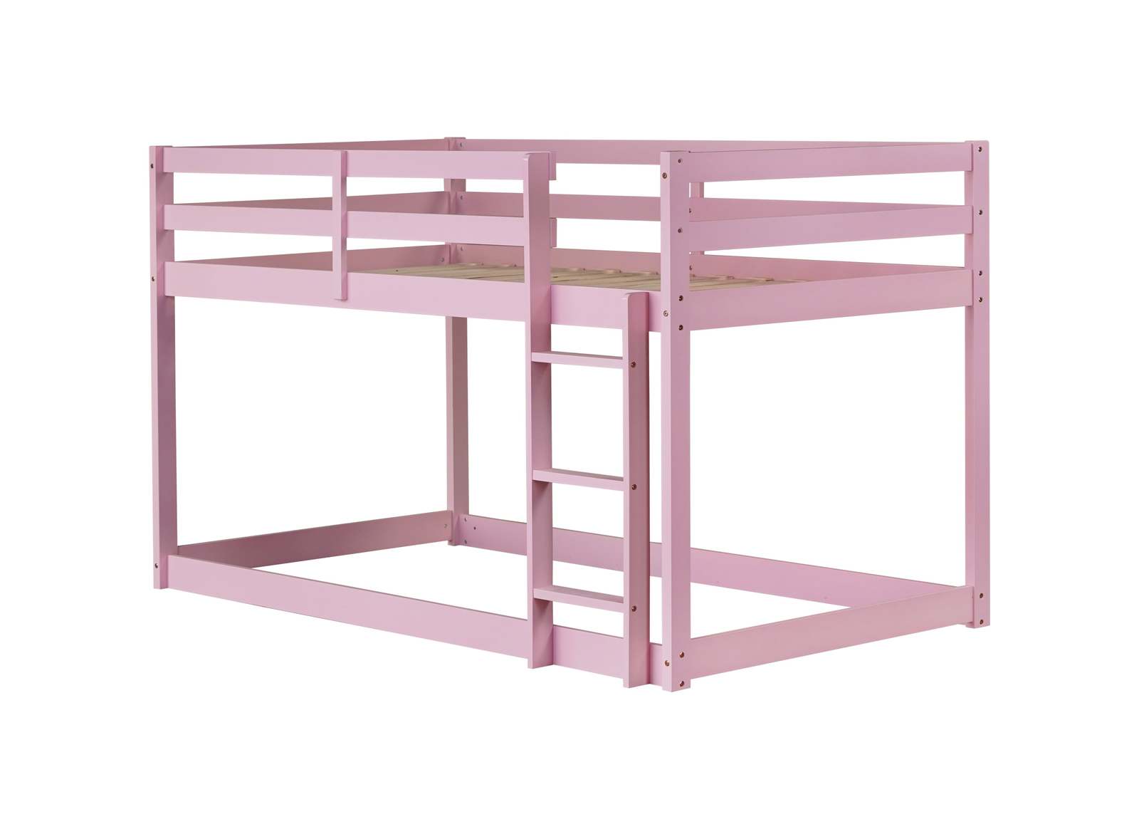 Pink Twin over Twin Solid Wood Floor Bunk Bed with Ladder & Slats