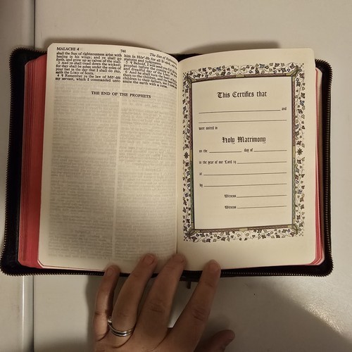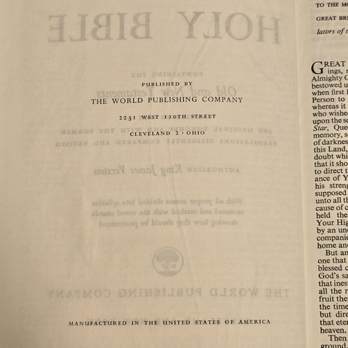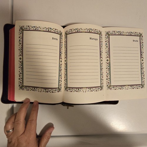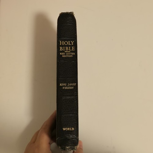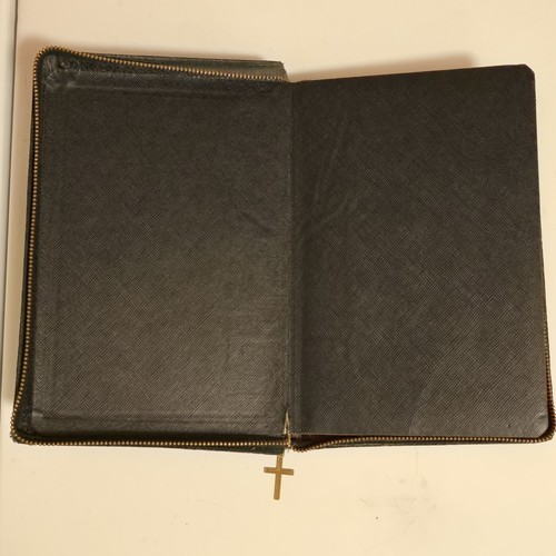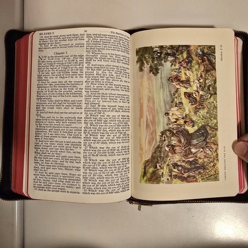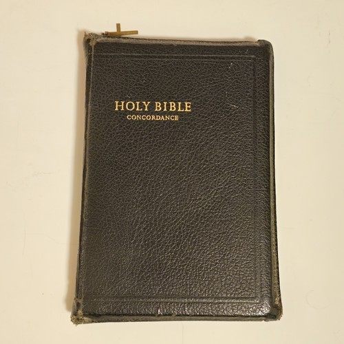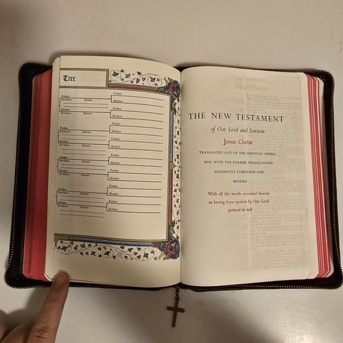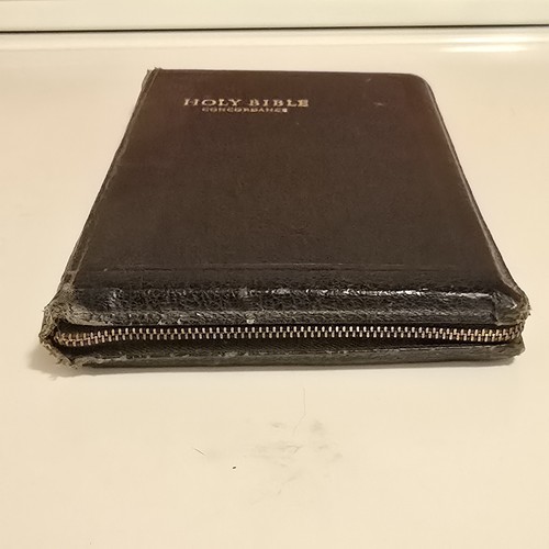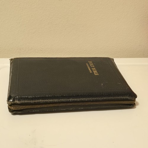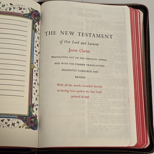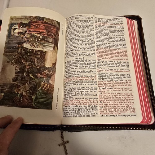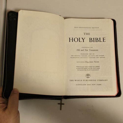 Beautiful Vintage KJV Holy Bible Illustrated - Red Letter - ZIP UP Black Leather Case with a Gold CROSS Zipper Pull - World Publishing.
