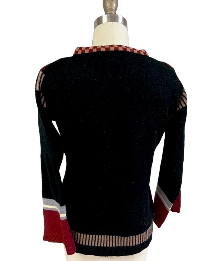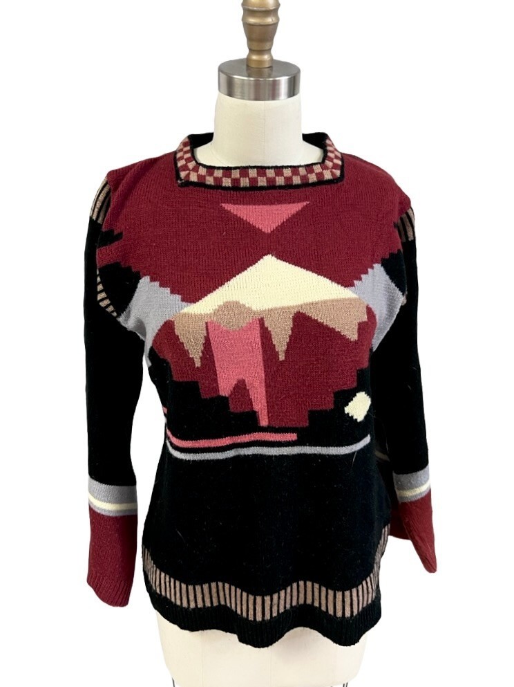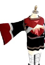 Vintage 1970s Currants by Jeri-Jo sweater, knit in Korea of 100% acrylic. Features striking black, purple, red, and pink color pattern with dramatic angel sleeves and ribbed waistband.