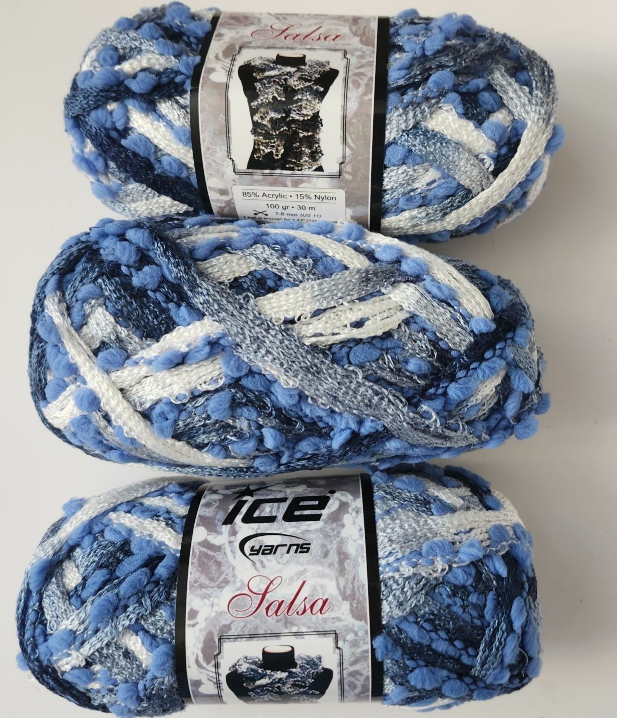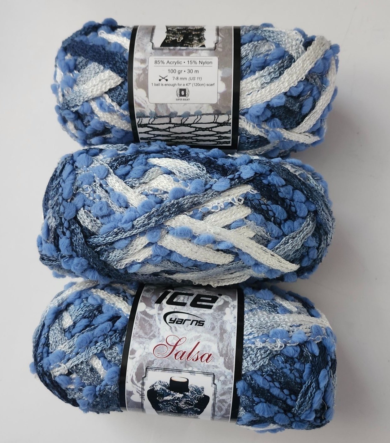 Ice Yarns Salsa Super Bulky Yarn 85% Acrylic 15% Nylon Blue/White Turkey 100g