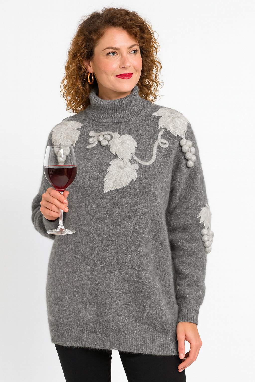 Charming and unique vintage 1989 I.B. Diffusion angora-blend turtleneck sweater, made in Hong Kong, with a whimsical 3D grape cluster motif across the front, sleeves, and back. Gray knit body with white "pom-pom" grapes, leaves, and vines, plus contrasting sleeves ? a playful and rare novelty knit. Oversized tunic silhouette with dropped shoulders and padded 1980s power shoulders.