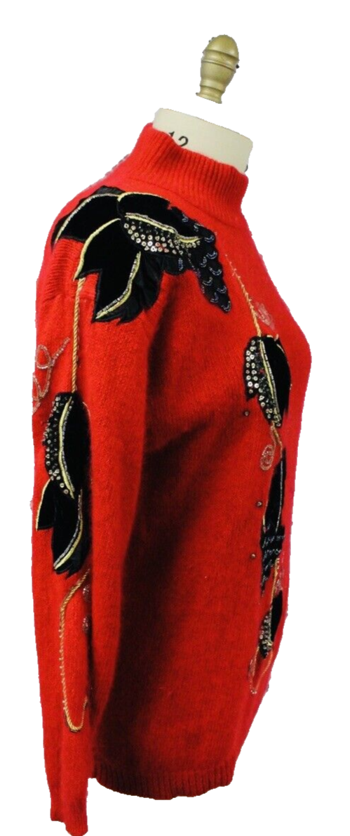 Dramatic vintage 1989 I.B. Diffusion statement sweater, crafted in a luxurious angora/silk/nylon/lambswool blend. Done in bold red with 3D beaded grape clusters and black velvet applique grape leaves, it embodies the late-80s maximalist knit trend. Features BIG shoulder pads, longer tunic length, and dropped shoulders for that unmistakable oversized glam silhouette.Made in Hong Kong.