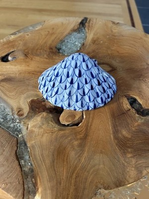 A decorative porcelain shell figurine featuring a blue and white scale pattern design.