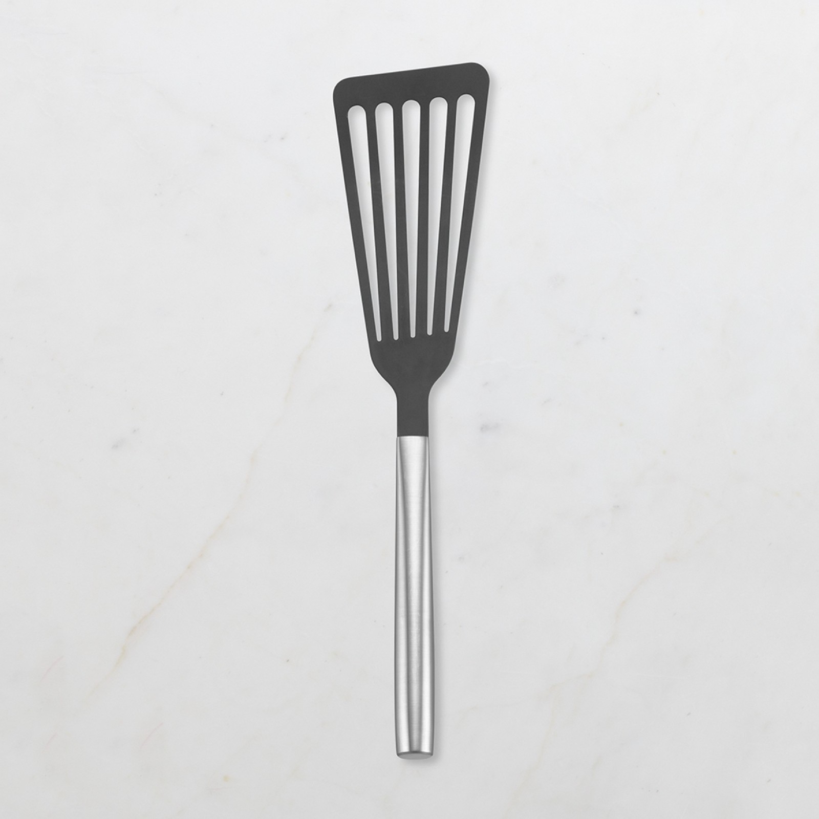 Drawing upon more than 50 years of culinary experience, we've designed and developed an exclusive line of nonstick kitchen tools ? perfect for use with nonstick cookware. Ideal for turning and serving fish fillets, our professional-quality spatula has a gently curved nylon head that helps keep even the most delicate seafood intact. The ergonomically engineered stainless-steel handle ensures excellent balance and control ? and makes the spatula exceptionally comfortable to use.