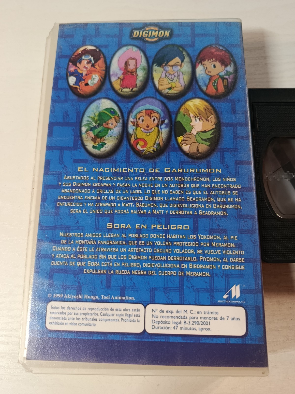 Official edition in VHS launched by Planeta Deagostini como part de the collectionde The classic digimon series. It contains dos unforgettable episodes de the first season: el Garurumon de birth and Sora in danger. One de Digimon de first physical editions in Spain, very sought after by collectorsde Anime retro.