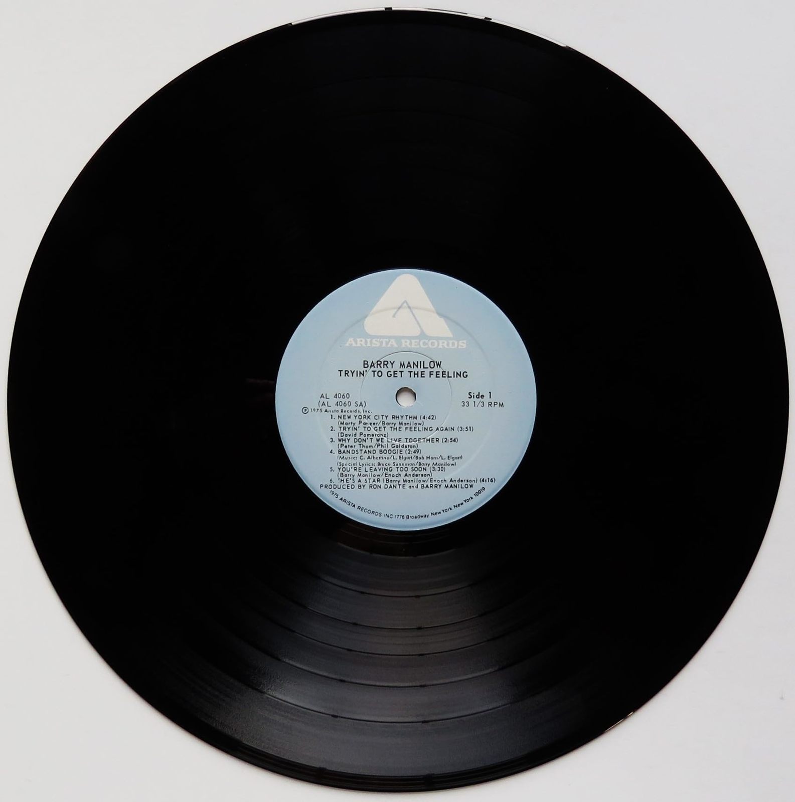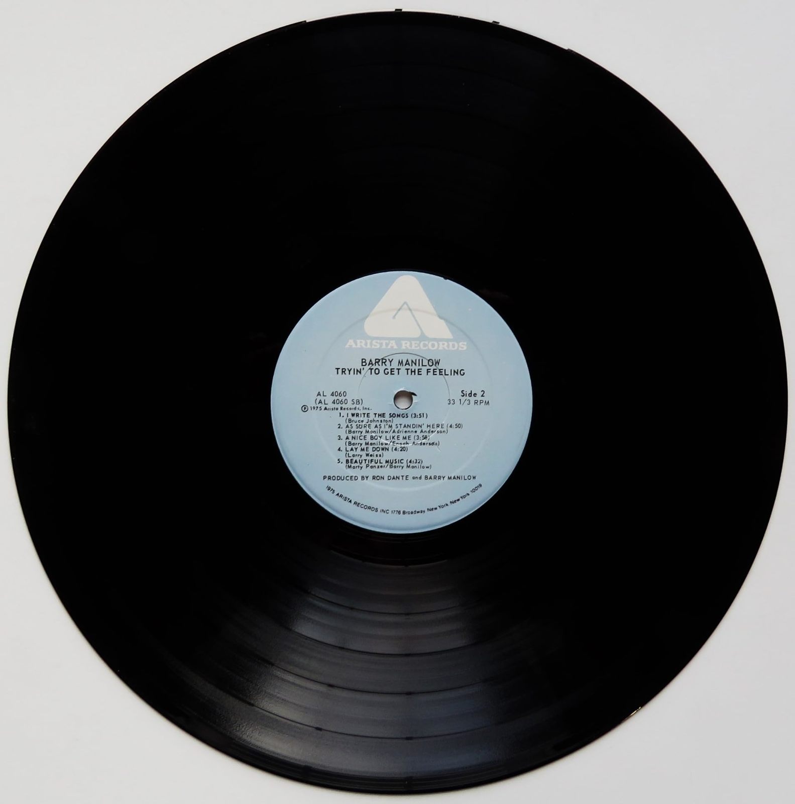 Product description: Barry Manilow's 3rd studio album "Tryin' To Get The Feeling" peaked @ #5 has been certified double Platinum. It produced 2 Top 10 hits, the title track #1 "I Write The Songs". Original 1975 Arista 12" vinyl LP record inner sleeve with song lyrics in an outer jacket. Track. "Title" (songwriter) [peak Billboard Hot 100 position] length: A1. "New York City Rhythm" (Barry Manilow, Marty Panzer) 4:42; A2. "Tryin' to Get the Feeling Again" (David Pomeranz) [#10] 3:51; A3. "Why Don't We Live Together" (Phil Galdston, Peter Thom) 2:54; A4. "Bandstand Boogie" (Charles Albertine, Larry Elgart, Les Elgart, Bob Horn, Barry Manilow, Bruce Sussman) 2:49; A5. "You're Leaving Too Soon" (Barry Manilow, Enoch Anderson) 3:30; A6. "She's a Star" (Barry Manilow, Enoch Anderson) 4:16; B1. "I Write the Songs" (Bruce Johnston) [#1; won Song of the Year Grammy Award for songwriter Johnston; nominated for Record of the Year] 3:51; B2. "As Sure as I'm Standin' Here" (Adrienne Anderson, Barry Manilow) 4:50; B3. "A Nice Boy Like Me" (Barry Manilow, Enoch Anderson) 3:58; B4. "Lay Me Down" (Larry Weiss) 4:20; B5. "Beautiful Music" (Barry Manilow, Marty Panzer) 4:32.