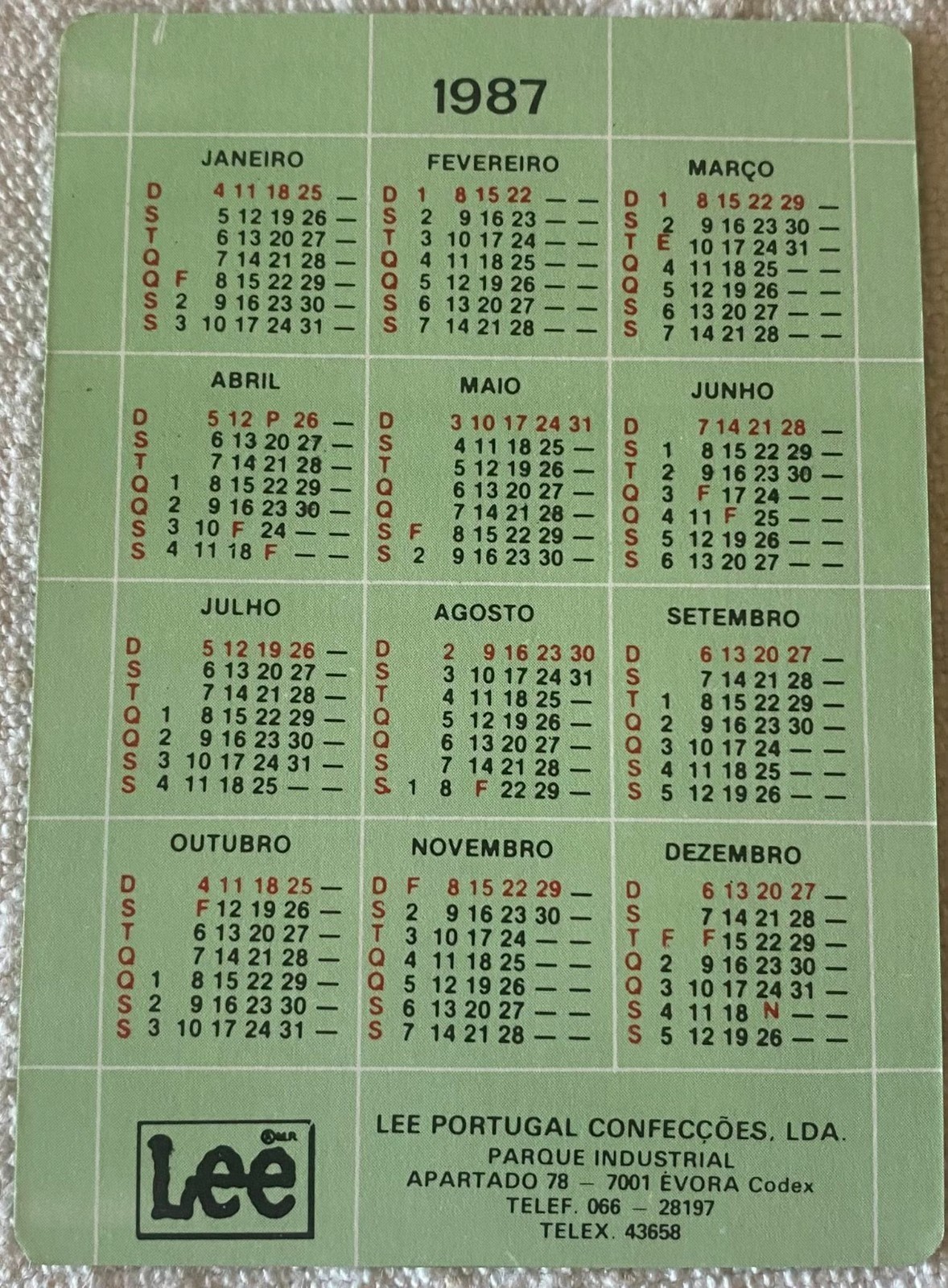 ⭕VTG, card pocket calendar 1987 LEE Portugal advertising