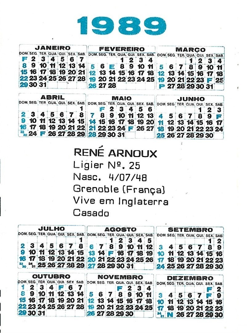 ⭕VTG Formula 1 RENÉ ARNOUX pocket calendar 1989 F1 pilot