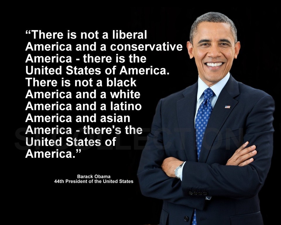 "THERE IS NOT A LIBERAL AMERICA AND A CONSERVATIVE AMERICA - THERE IS THE UNITED STATES OF AMERICA. THERE IS NOT A BLACK AMERICA AND A WHITE AMERICA AND A LATINO AMERICA AND ASIAN AMERICA - THERE'S THE UNITED STATES OF AMERICA."