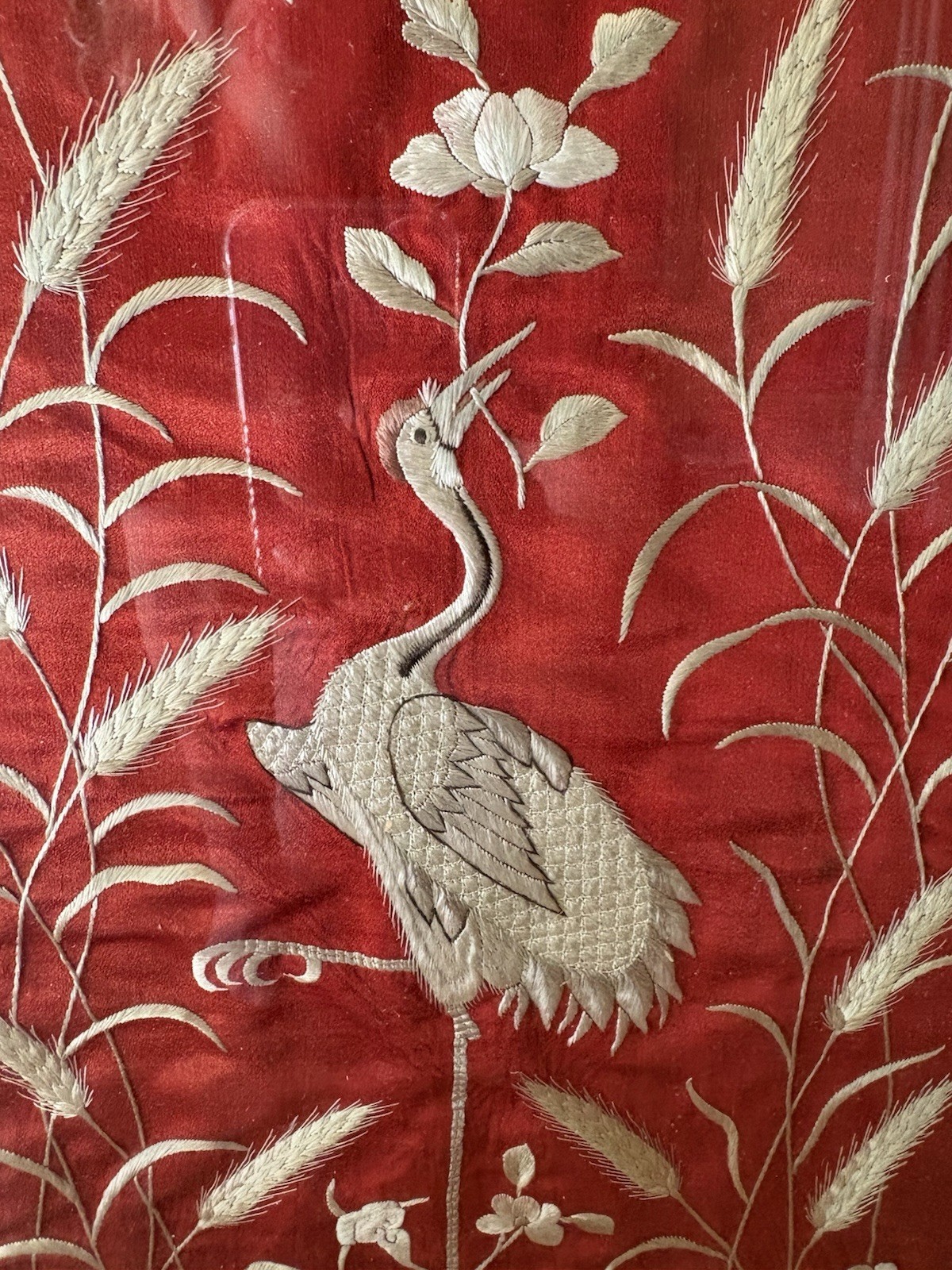 This textile represents the sophisticated embroidery techniques of Chinese imperial court dress. Mandarin robes were worn by officials and nobility during the Qing Dynasty (1644-1912). The crane motif was particularly significant, symbolizing longevity, peace, and high rank in Chinese culture.