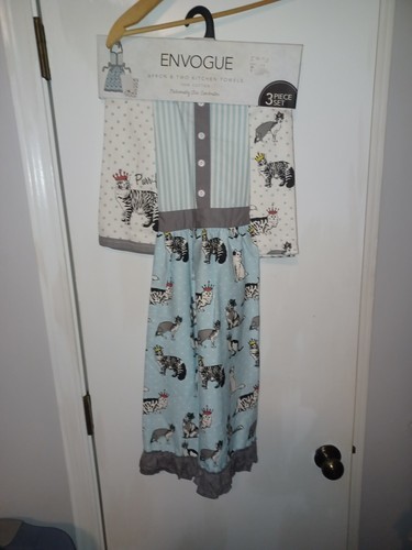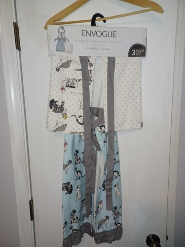 NEW Envogue Chic Kitty Cat Print 3 Piece Kitchen Towel and Cooking Apron Set