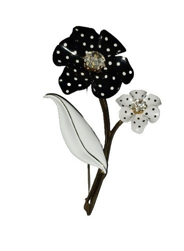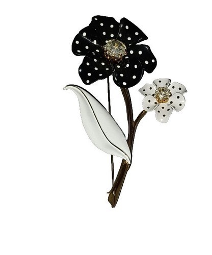Vintage Signed AVON NR Black & White Polka Dot Rhinestone Flower Enamel Brooch
