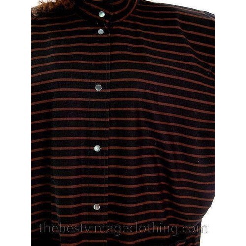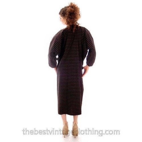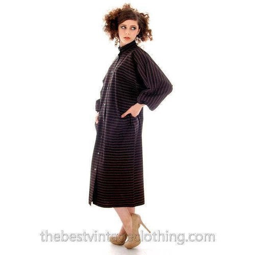 This dress is a total piece of art, straight from the mind of legendary designer Vuokko Nurmesniemi, who left Marimekko in 1960 to found her own brand and focus on a clean, architectural aesthetic. This dress embodies her signature style, made from a heavy black cotton with a subtle brown horizontal stripe throughout. It features a silver snap popper front, two huge patch pockets, and a clean, boxy silhouette. It?s in excellent condition and is a timeless, sustainable find for anyone who loves minimalist mod style.