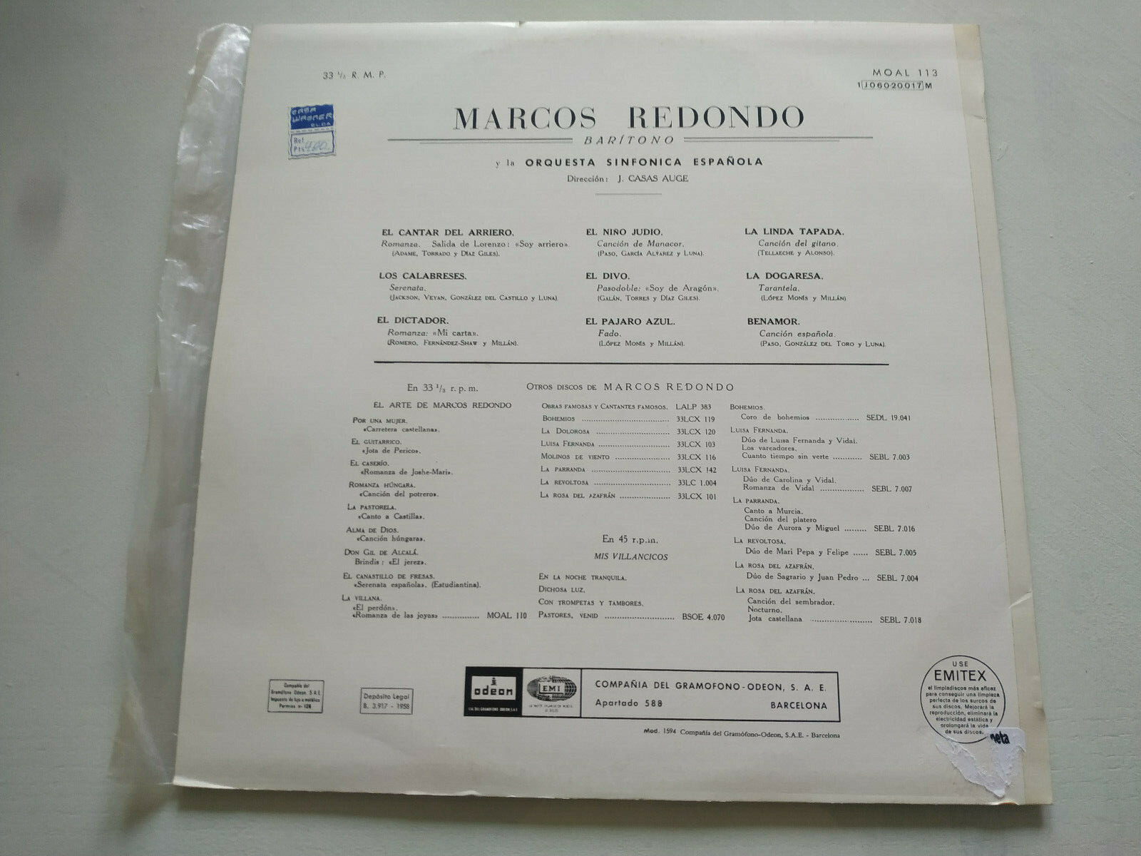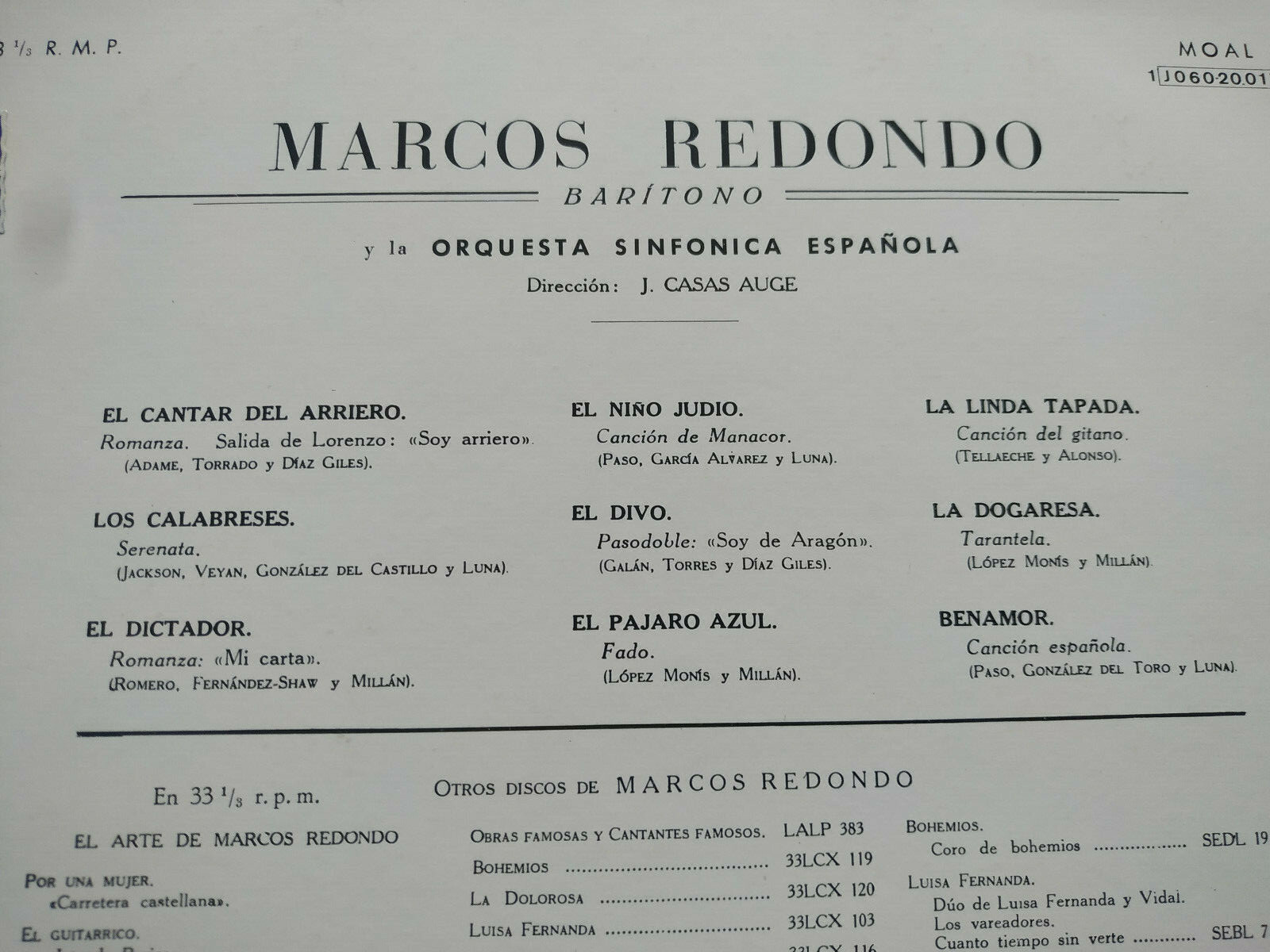 Marcos Redondo Un Grande cantante spagnolo EMI 1958 - LP 12 " Vinilo VG/VG