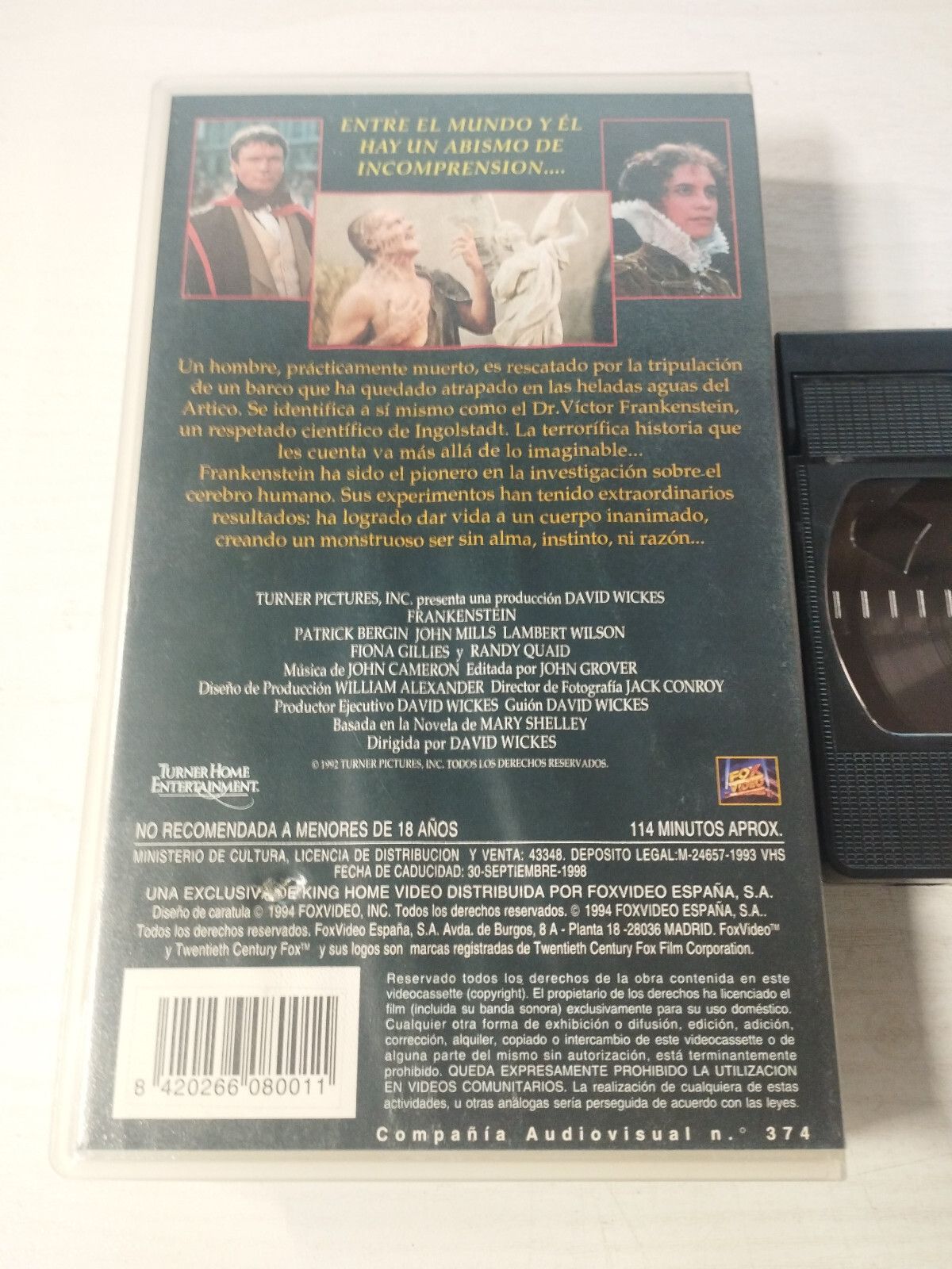 Frankenstein Patrick Bergin Randy Quaid Terror 1993 - VHS Spanish Tape