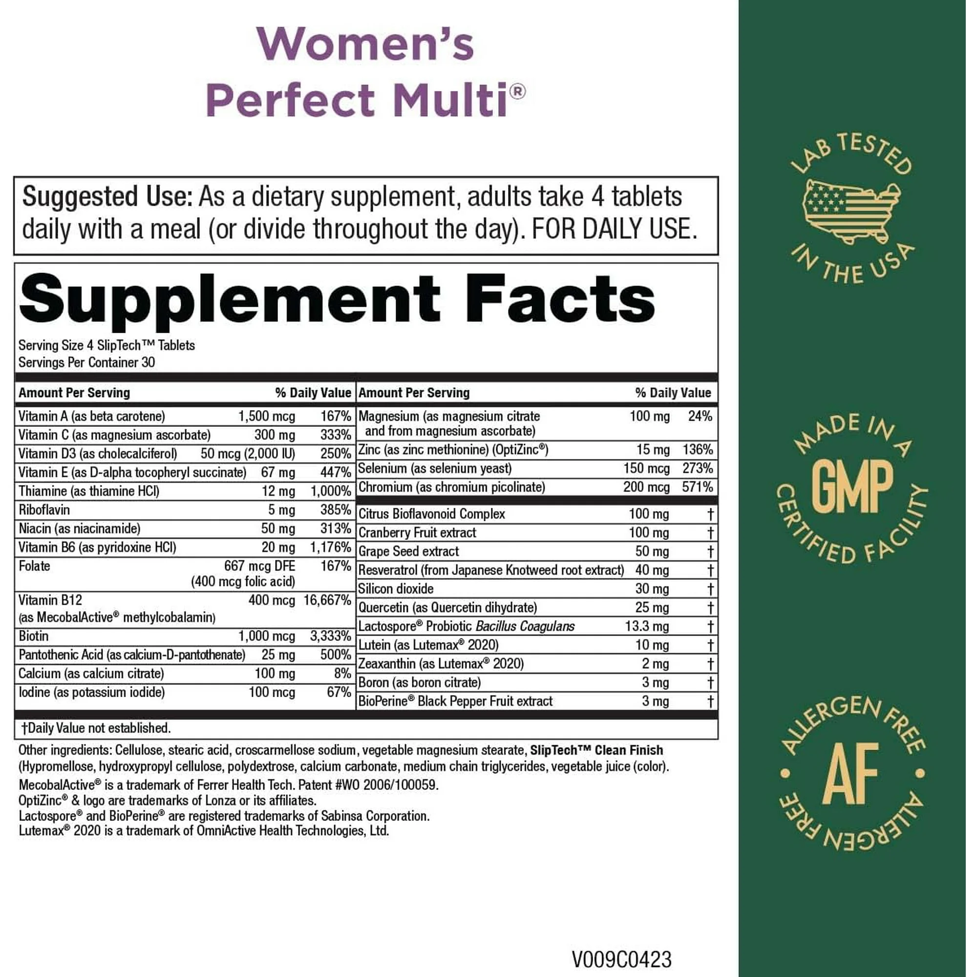 ? INGREDIENTS ORDINARY MULTIS DON’T HAVE: With a wide array of ingredients including Lutemax 2020 Lutein, Cranberry Fruit, Lactospore Probiotics, MecobalActive B12, Grape Seed Extract and more, Women’s Perfect Multi delivers benefits other multi don’t.