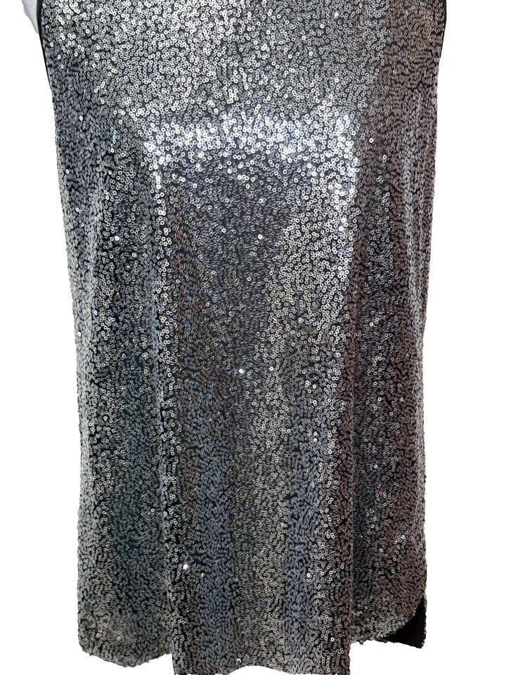 This silver sequin tank top offers a shimmering, stylish look. Lightweight and easy to pair with various outfits for added sparkle.