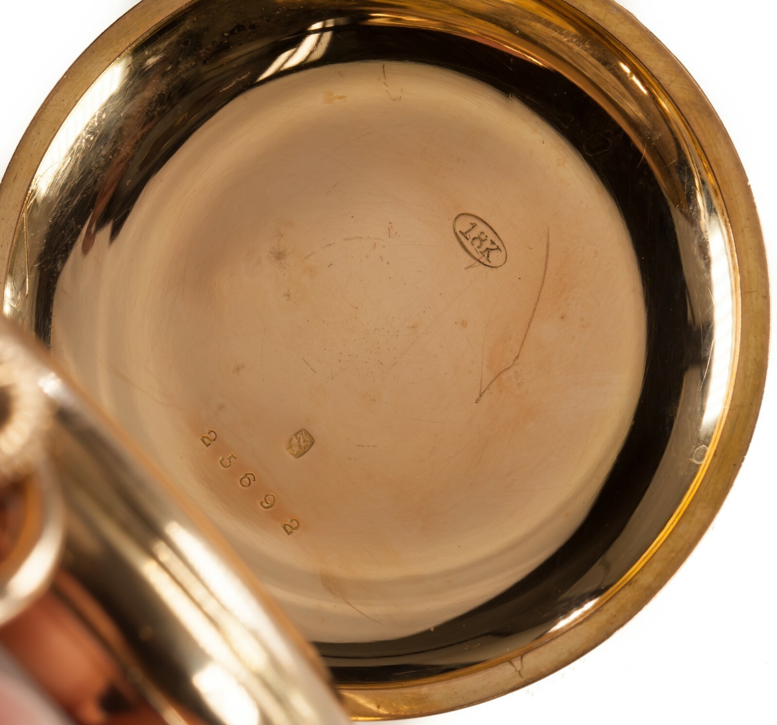 18k Gelbgoldgehause mit verzierter innerer Abdeckung, maschinell gedrehte (Guilloche) Außenabdeckung