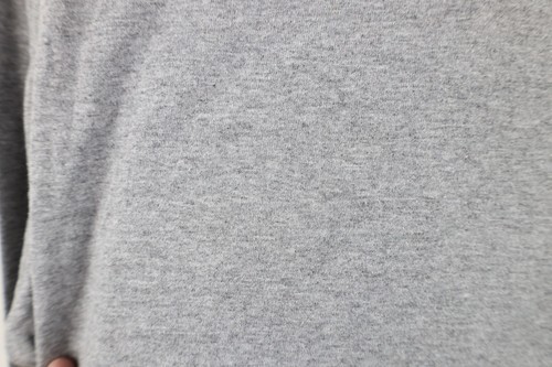 Logo faded left arm. Collar, cuffs discolored. Dark spots, pilling. Color faded