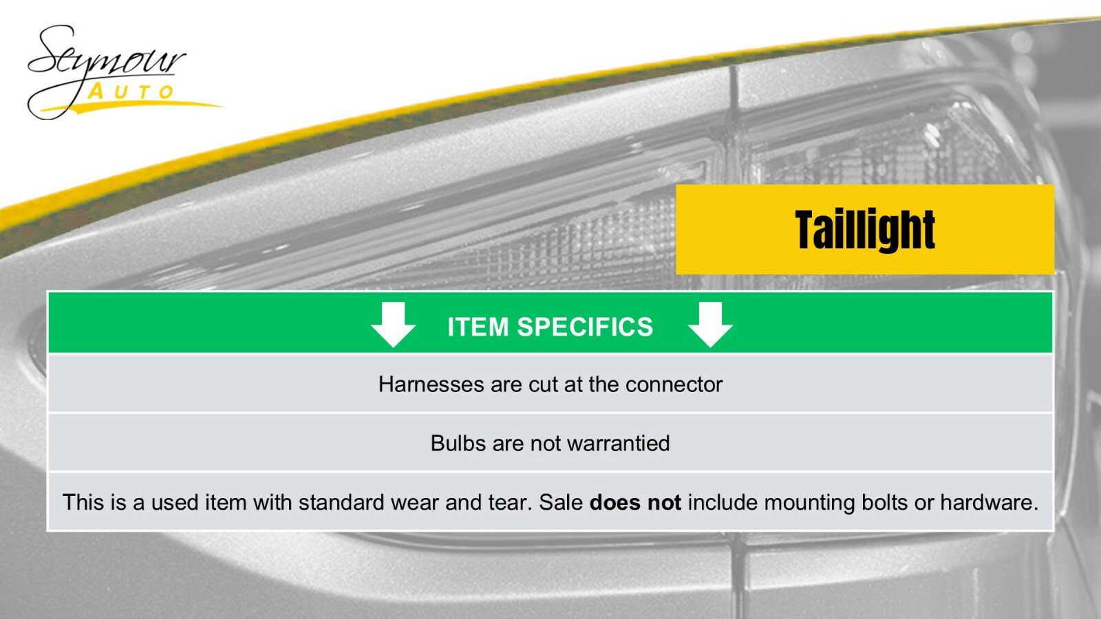 This is a Used Taillight removed from a salvage vehicle. This is sold as the Taillight Assembly only. It does not include the plug, bulb, or harness. If these items are left on, they are from convenience only and not covered by our warranty. You are covered by our 6 Month Part Warranty. LEFT IS DRIVERS SIDE AND RIGHT IS THE PASSENGERS SIDE. This taillight has been inspected and is functional, however it may have slight scuffs, scratches, or blemishes. Please contact us with any questions your may have!