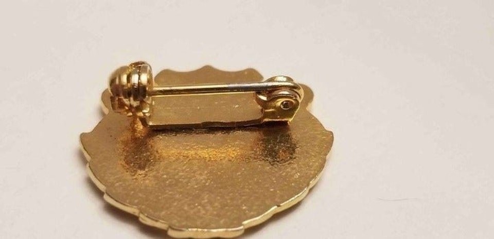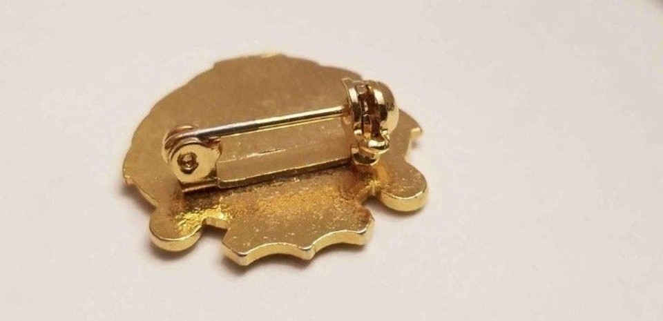 Condition: in good preowned wearable condition. Minimal signs of wear on the front. Pin on the back has some of the gold coming off.