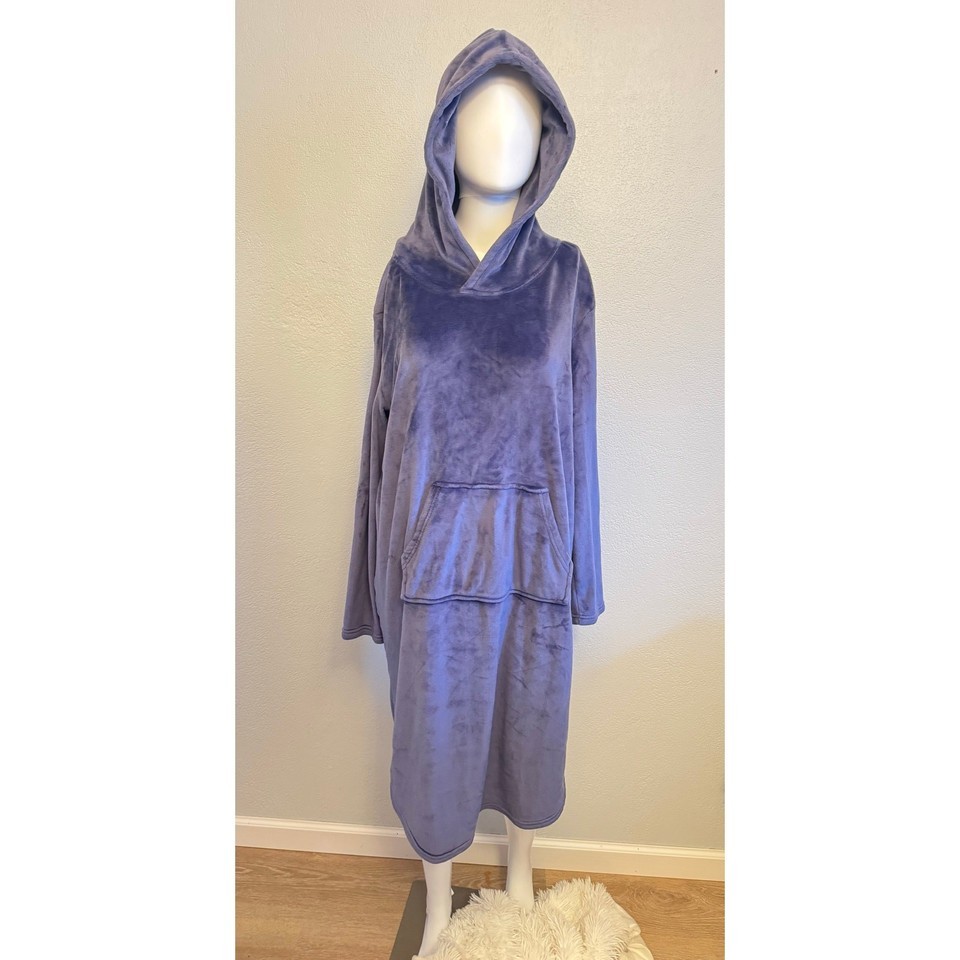Stay warm and cozy in this soft Purple Cozy Heat Sleepwear hoodie dress. Made in China, shell 95% polyester and 5% spandex for a soft, stretchy fit. Features a hood, long sleeves, and waist pockets for comfort. Fluffy texture gives it a snuggly feel, perfect for lounging or sleeping. Measures approx. 39? long and 24? pit to pit. Relaxed oversized fit, tagged size S/M, fits true to size.