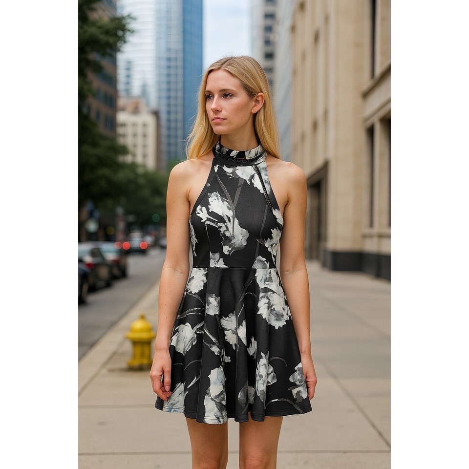 This stunning B. Darlin dress features a black base with elegant white floral prints, a high halter neckline with back button closure, and a flattering fit-and-flare silhouette. Made from a comfortable polyester-spandex blend with a full polyester lining, it offers both style and flexibility. Perfect for semi-formal occasions, parties, or date nights.