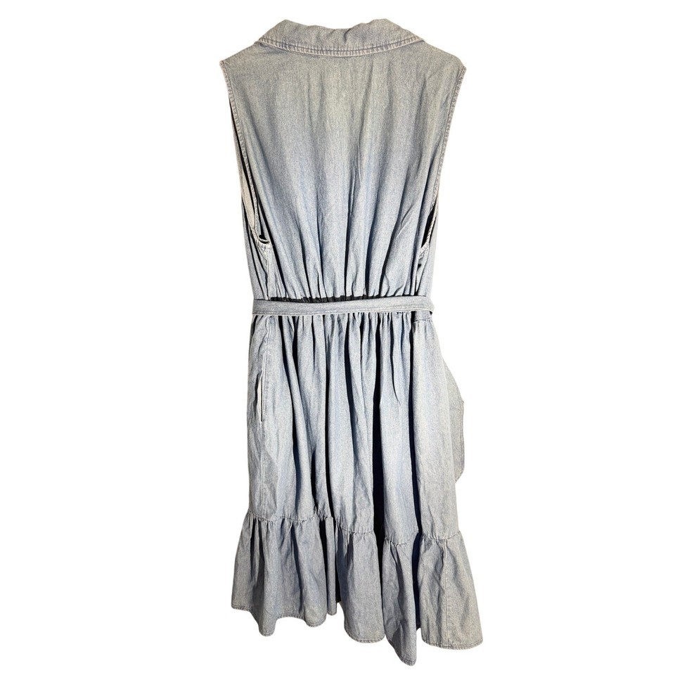This Draper James sleeveless shirt dress blends southern charm with casual denim style. Crafted from 100% cotton, this lightweight chambray dress features a collared neckline, button-down front, and a flattering self-tie belt that cinches the waist. The ruffle-tiered hem adds a playful, feminine touch perfect for spring and summer. Ideal for daytime outings, travel, brunch, or casual weekends.