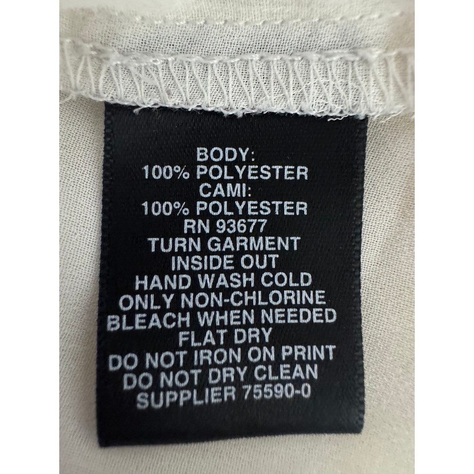Fabric: 100% polyester shell, 100% polyester cami lining (per care tag).