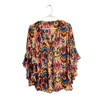 Make a bold statement in this Vince Camuto blouse featuring a vibrant bohemian-inspired print in shades of red, blue, gold, and cream. Designed in a flattering relaxed silhouette, this size 2X top includes pleated fabric, feminine ruffle sleeves, and a split neckline. Lightweight and flowy, it?s perfect for styling with jeans or trousers for a polished yet effortless look.