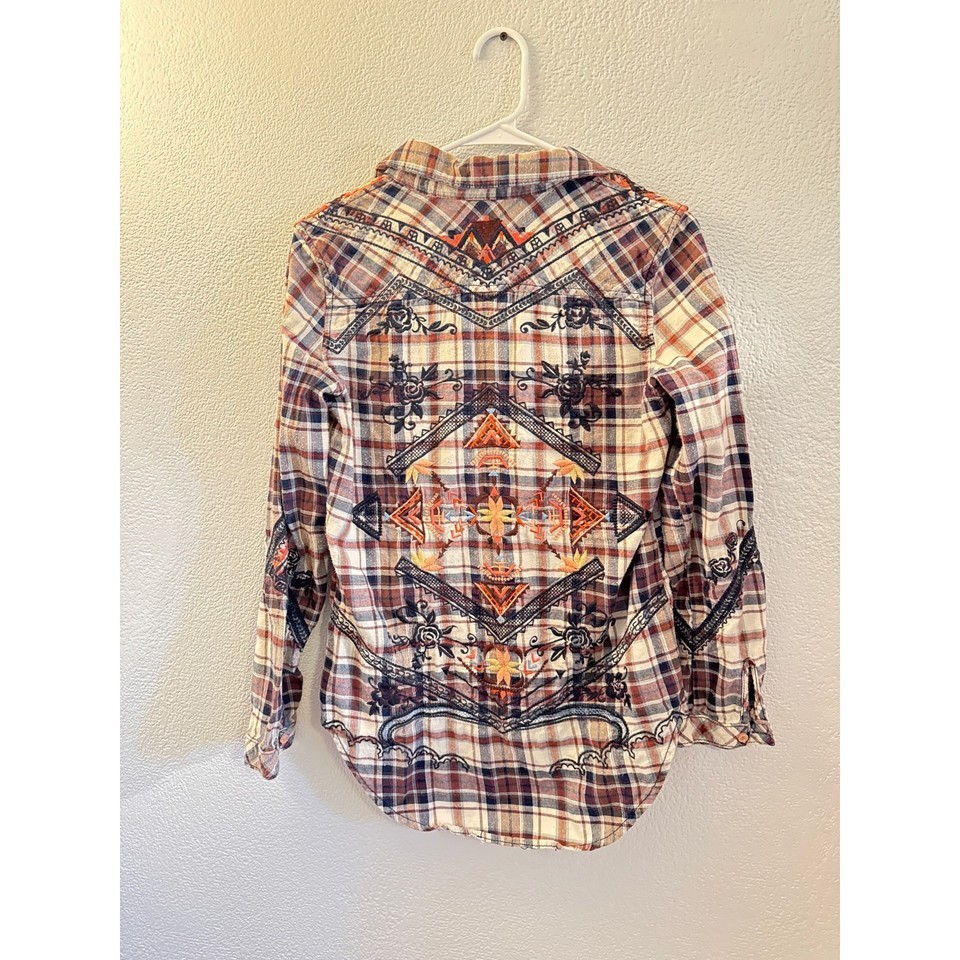 Stylish Driftwood women?s Western shirt with embroidered detailing on the back and shoulders. Made in China, size Small. Crafted from 100% cotton for comfort and breathability. Features long sleeves, a Western-inspired design, and beautiful embroidery that adds a unique touch.