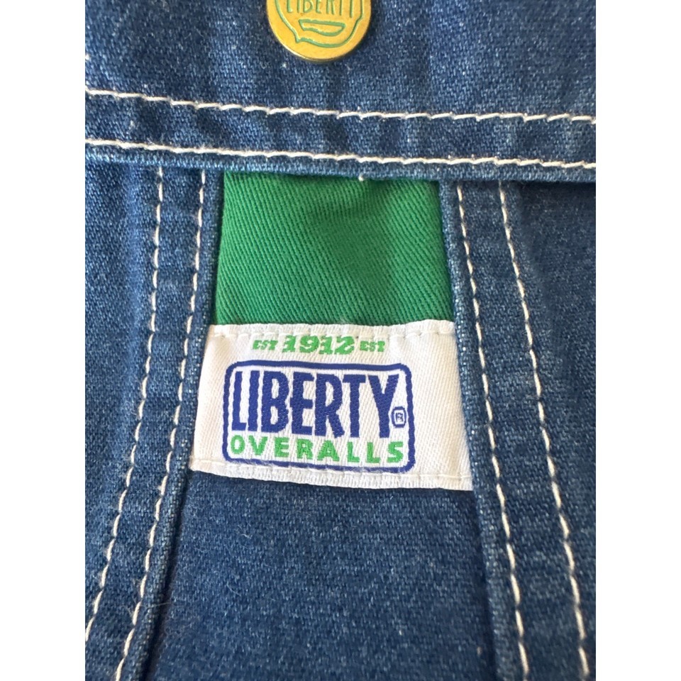 Classic Liberty denim overalls, size 34x30, made from 100% cotton. Designed for durability and comfort, these bib overalls feature multiple utility pockets including a large bib pocket with zippered compartment, deep front and back pockets, and a side tool pocket. Adjustable shoulder straps with brass hardware provide a secure fit. A staple for workwear, outdoor projects, or casual retro style.