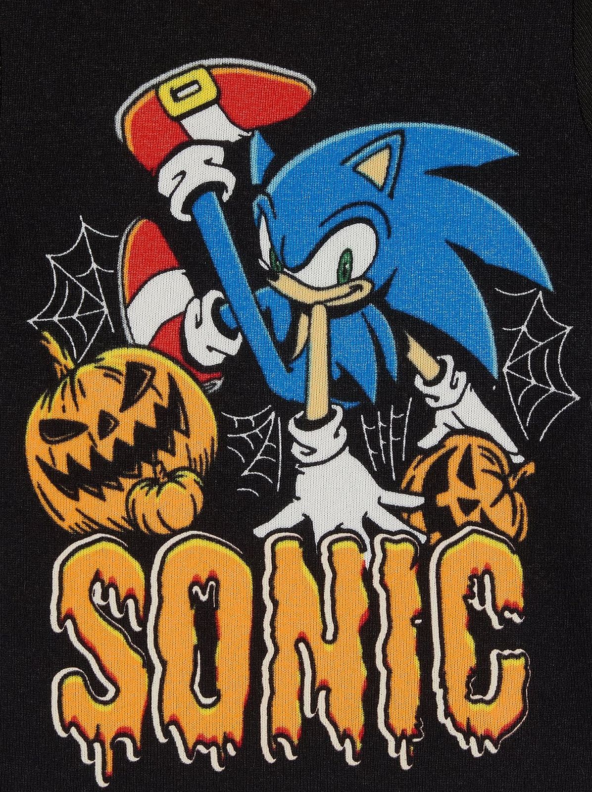 The sleep top features a classic crew neckline with contrast neckline and cuffs, making it both stylish and comfortable. It showcases a fun Halloween-themed Sonic the Hedgehog graphic on the front, perfect for adding a touch of spookiness to bedtime.