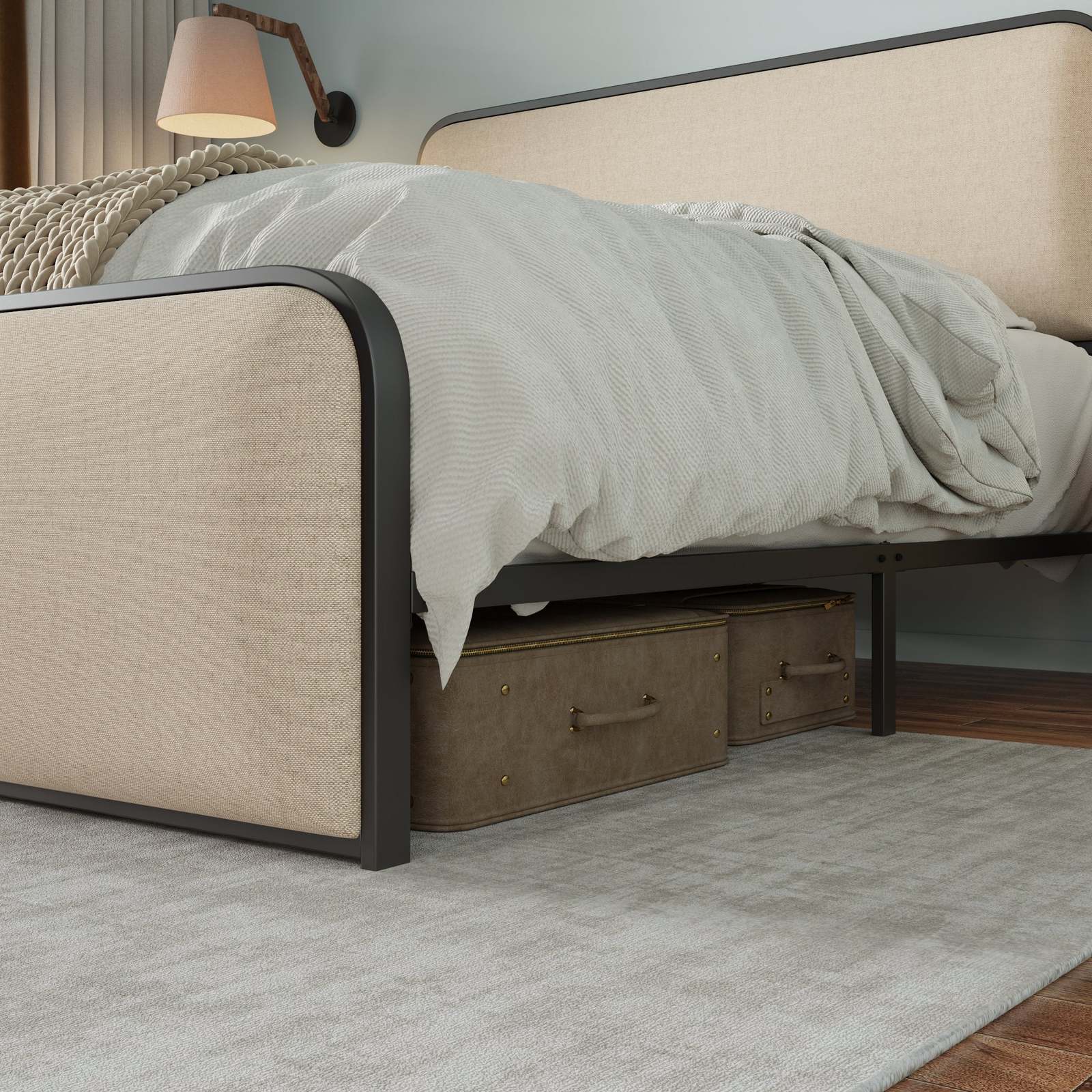 Modern King Beige Metal Bed Frame | Upholstered Headboard Storage