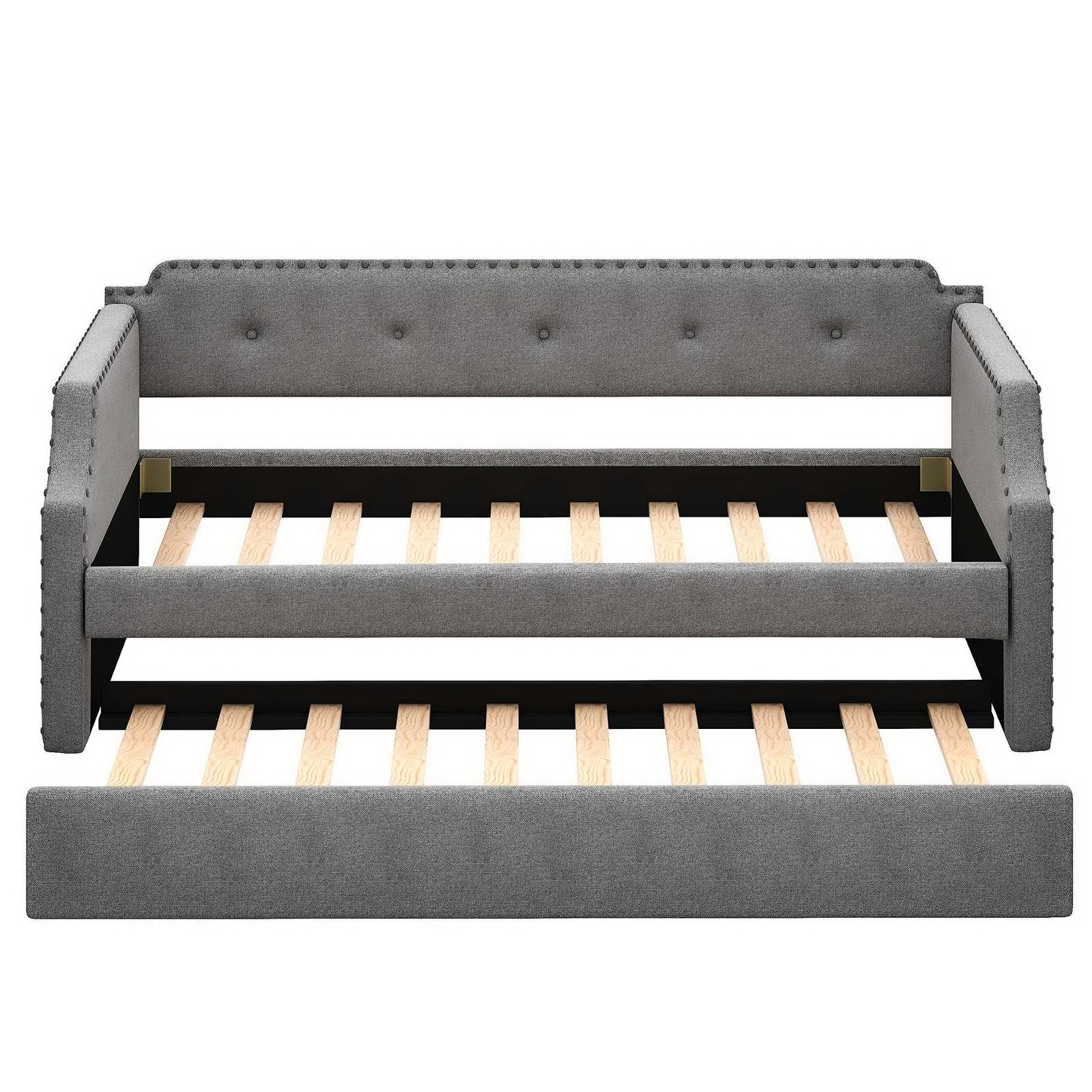 Gray Upholstered Twin Daybed with Trundle & Wood Slat Support