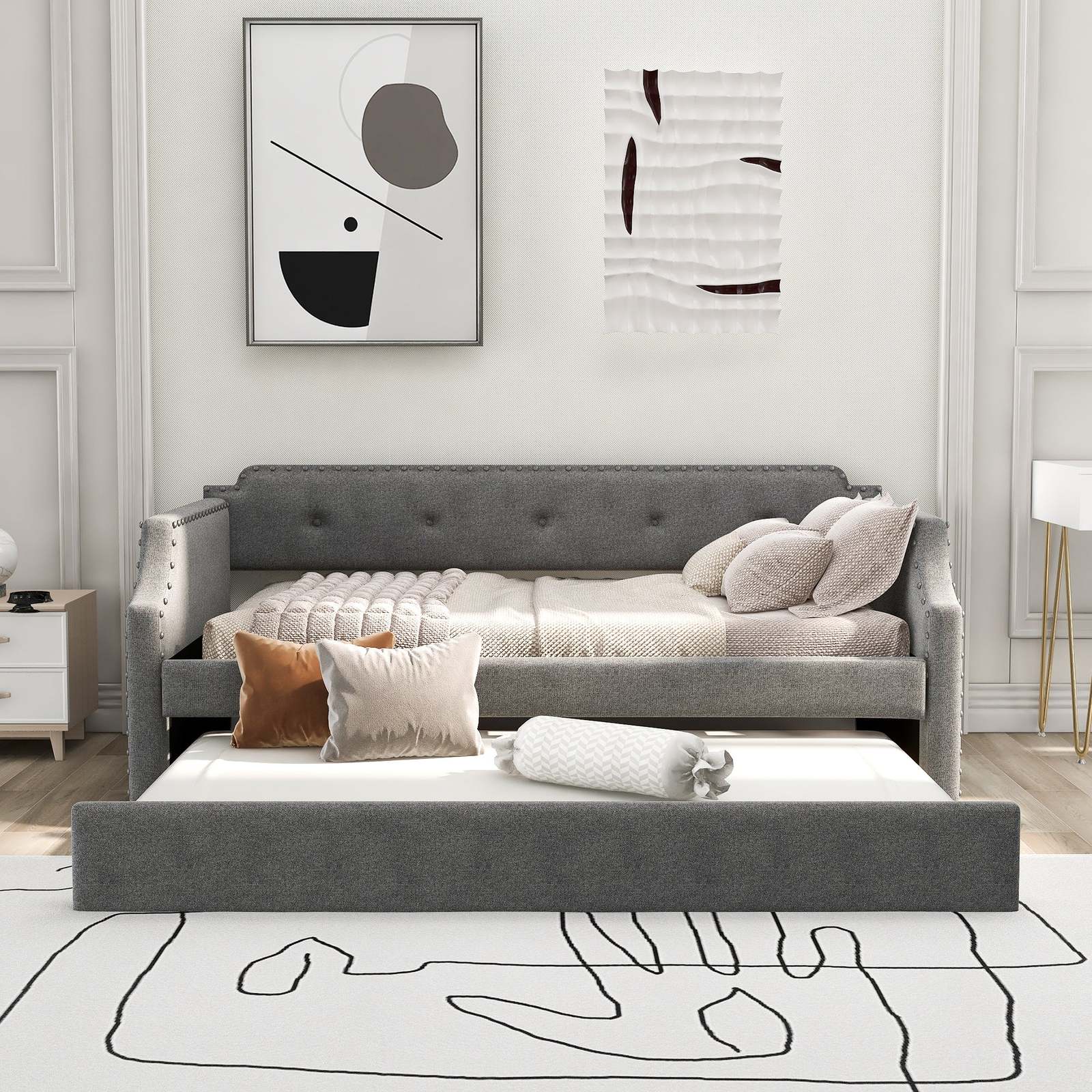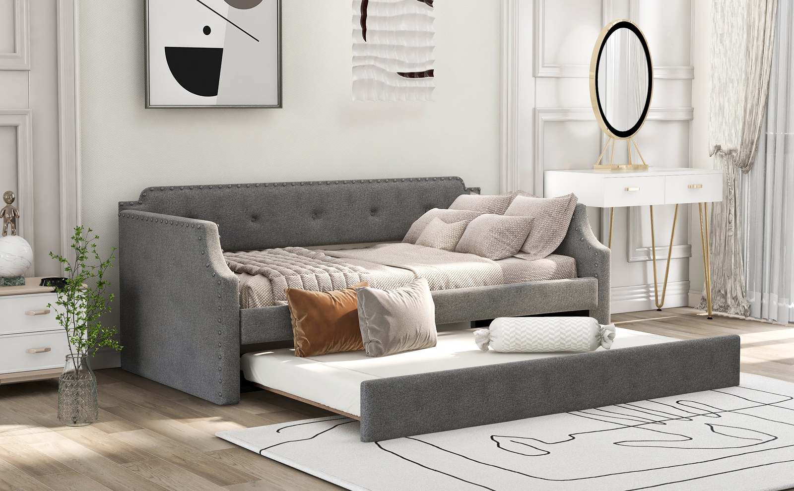 ?[Upholstered Daybed] Elegant style Upholstered in carefully-selected linen fabric, features two armrests, this daybed with trundle not only suits any home decor, but is timeless in its design. The soft textile bedhead creates coziness, while the single color of the design creates versatility.
