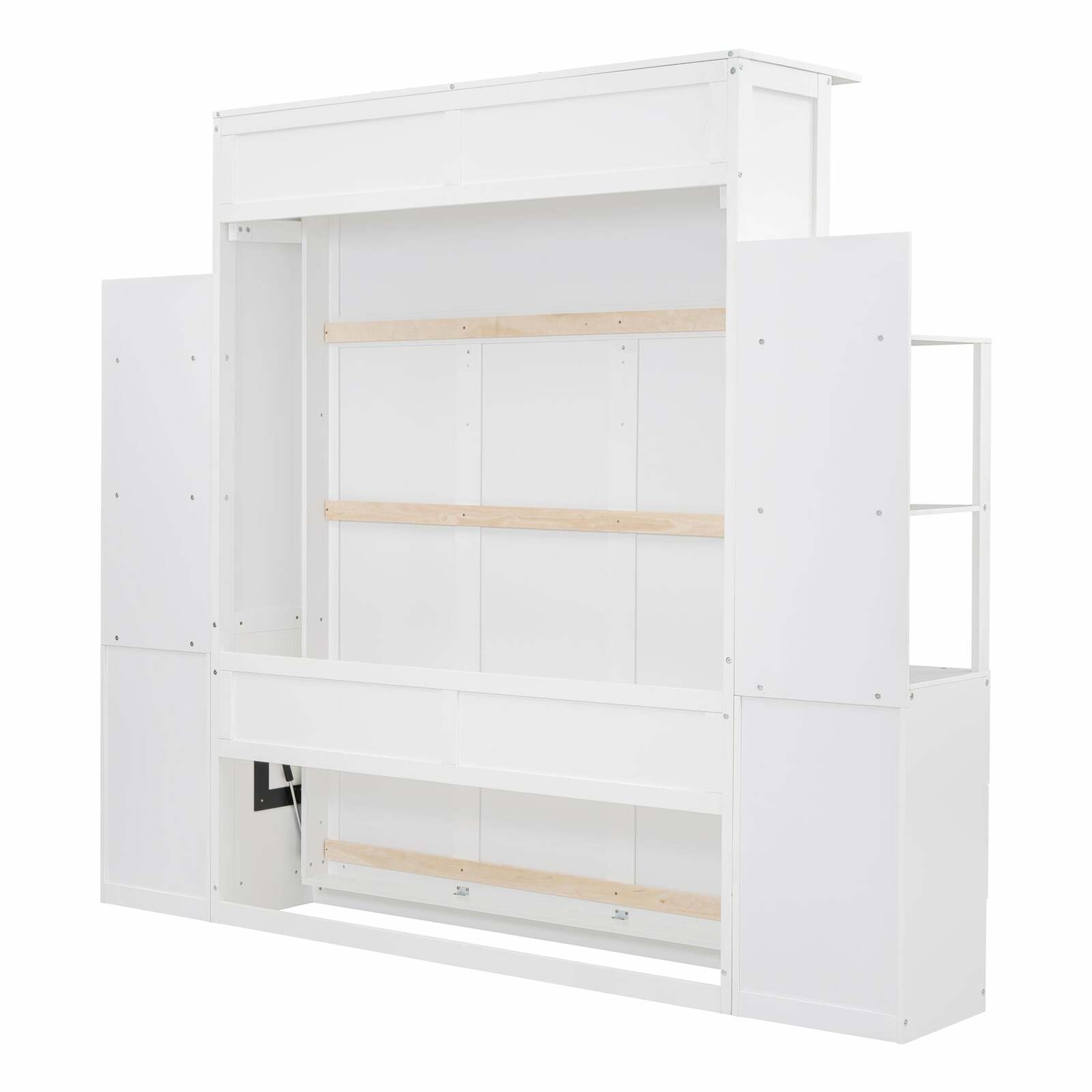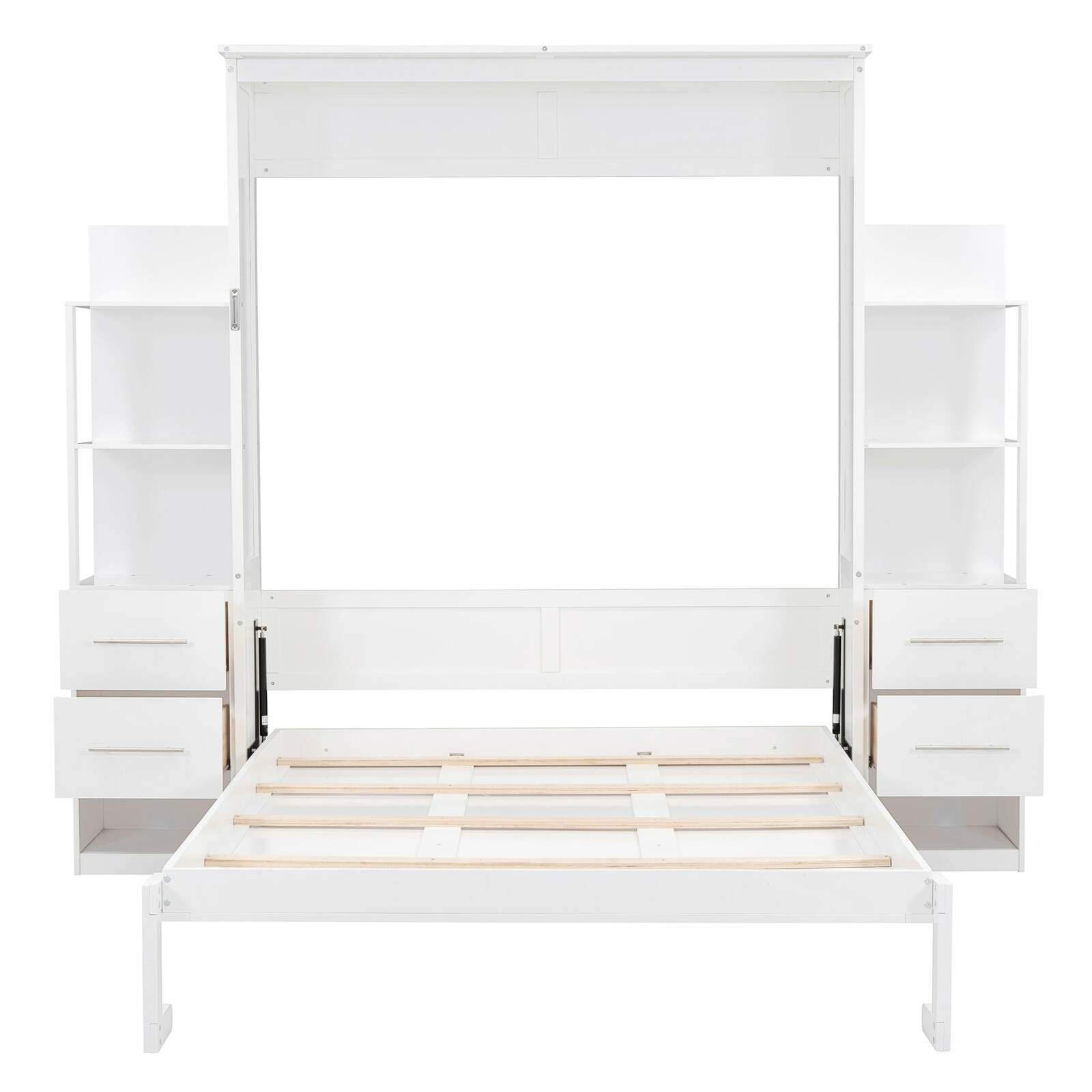 Queen Size Murphy Wall Bed with Shelves, Drawers & LED Lights - White