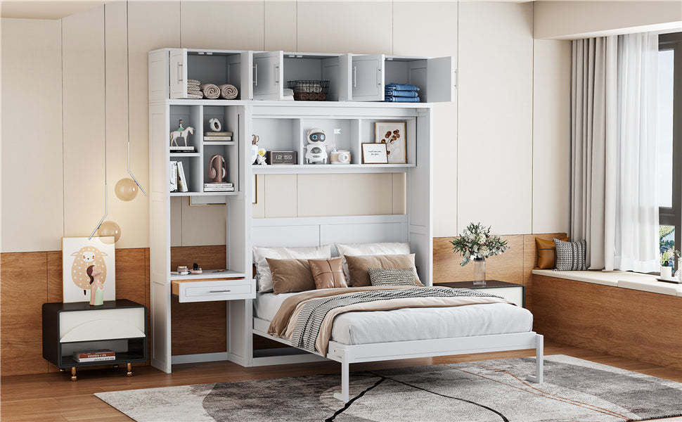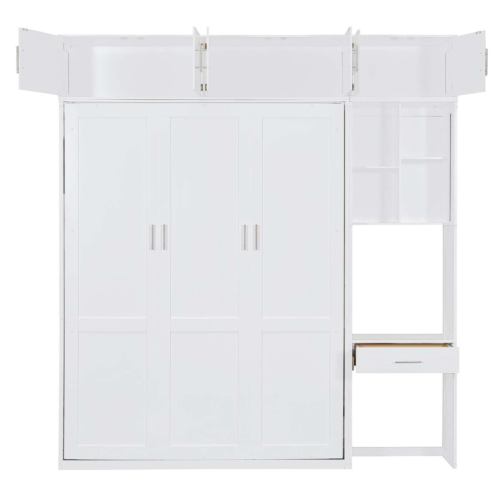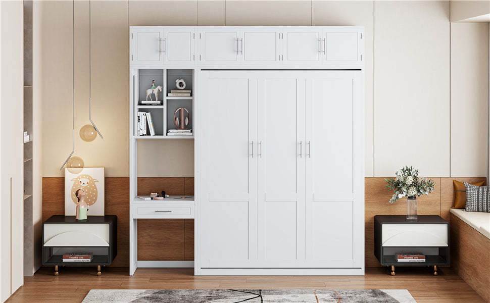 Transform your space with this queen-size Murphy bed, expertly designed to combine comfort, storage, and functionality. Featuring three spacious overhead cabinets, integrated side shelves, top display shelving, and a built-in desk, this all-in-one solution maximizes every inch of your home. Whether you're living in a compact apartment, a studio, or setting up a multifunctional guest room, this bed adapts to your lifestyle. The seamless wall bed design folds away easily when not in use, creating an open and tidy environment. Crafted for both everyday sleep and smart organization, it offers the perfect balance of practicality and modern style.