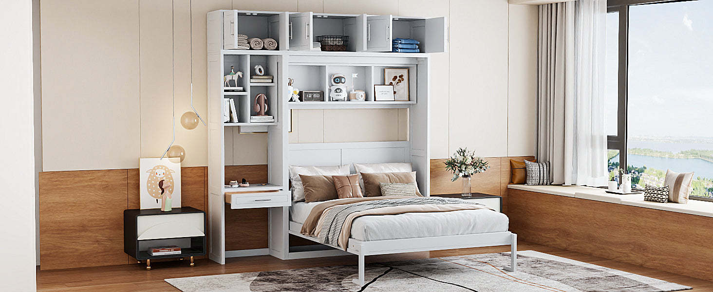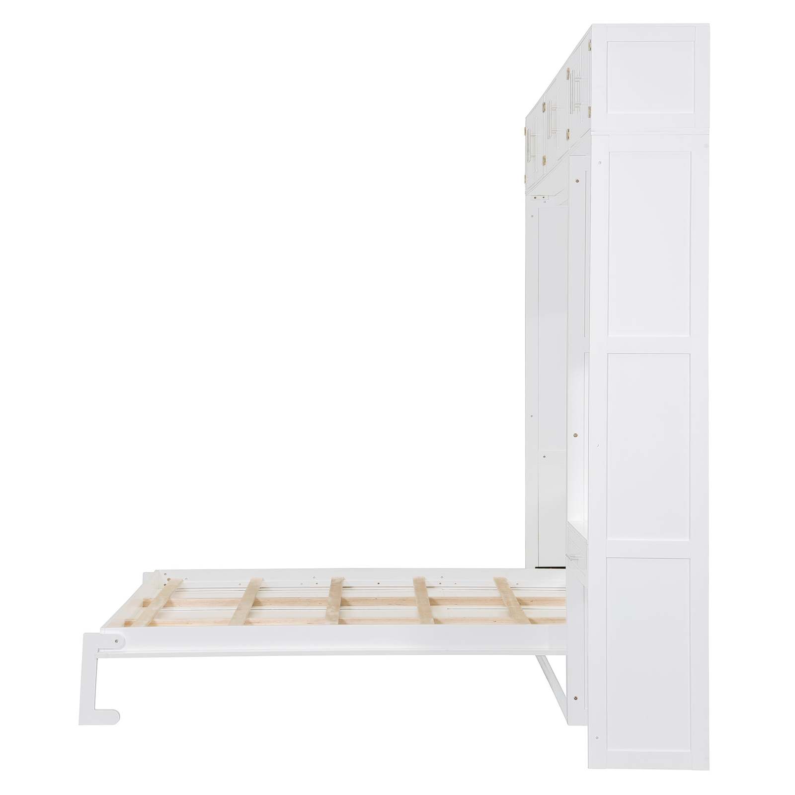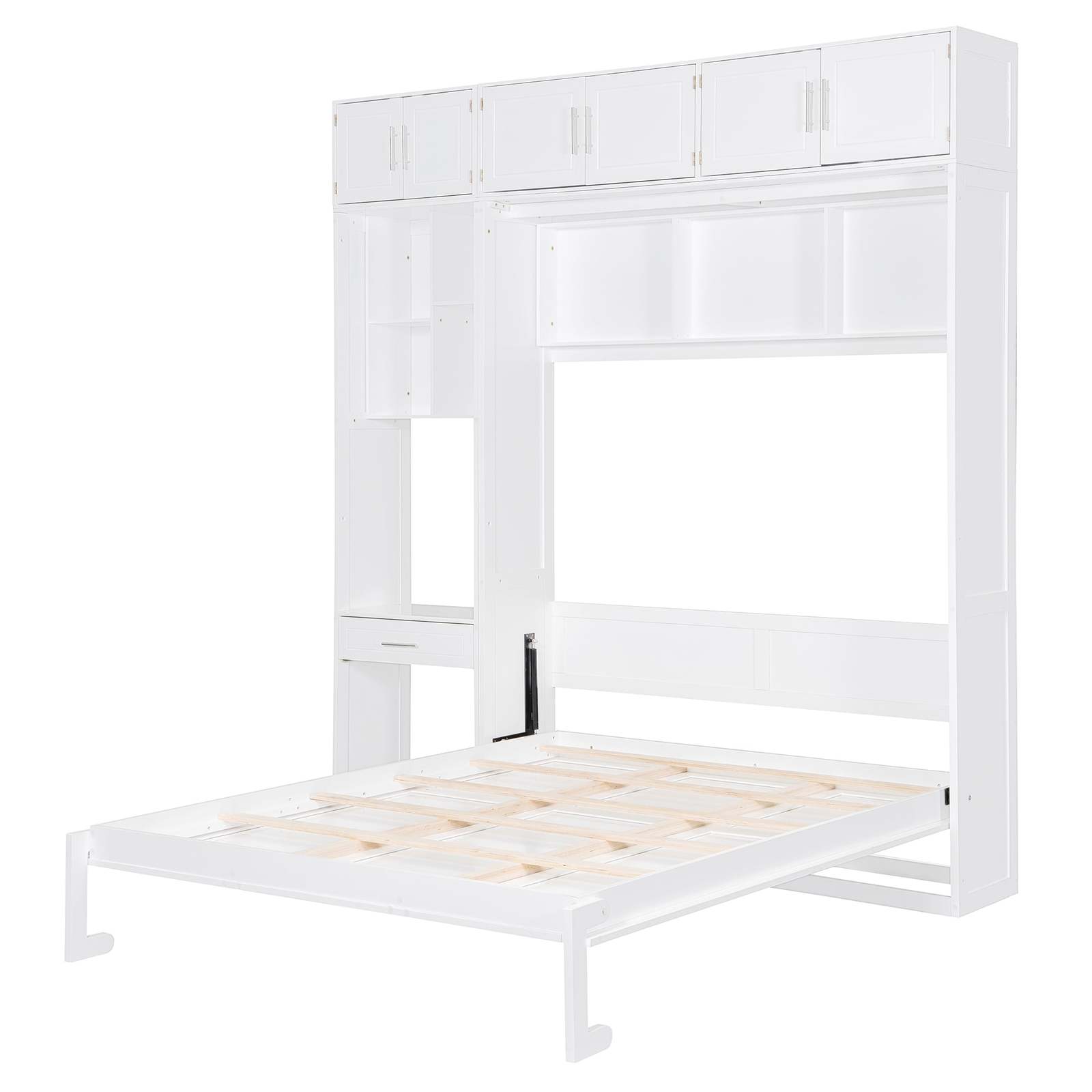 Queen Wall Murphy Bed with Desk, Shelves, Cabinet - Space Saving White