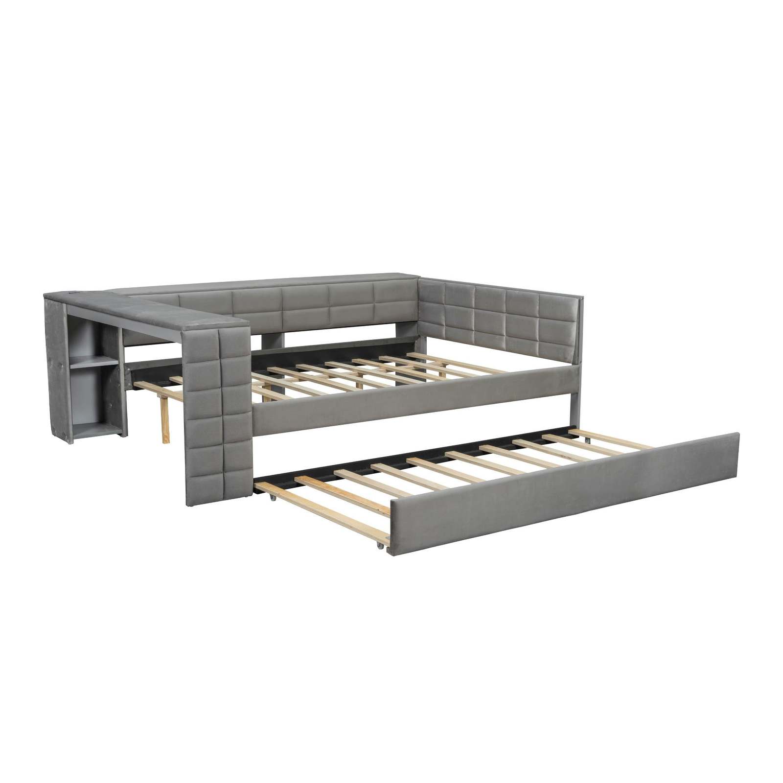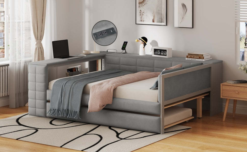 Full Size Upholstered Platform Bed with Storage Shelves, Desk, Charging Station and Trundle, Gray