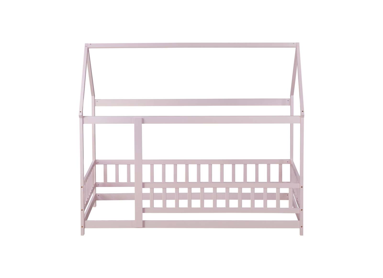 Pink Twin House Floor Bed with Roof & Guardrails - Wooden Toddler Bed