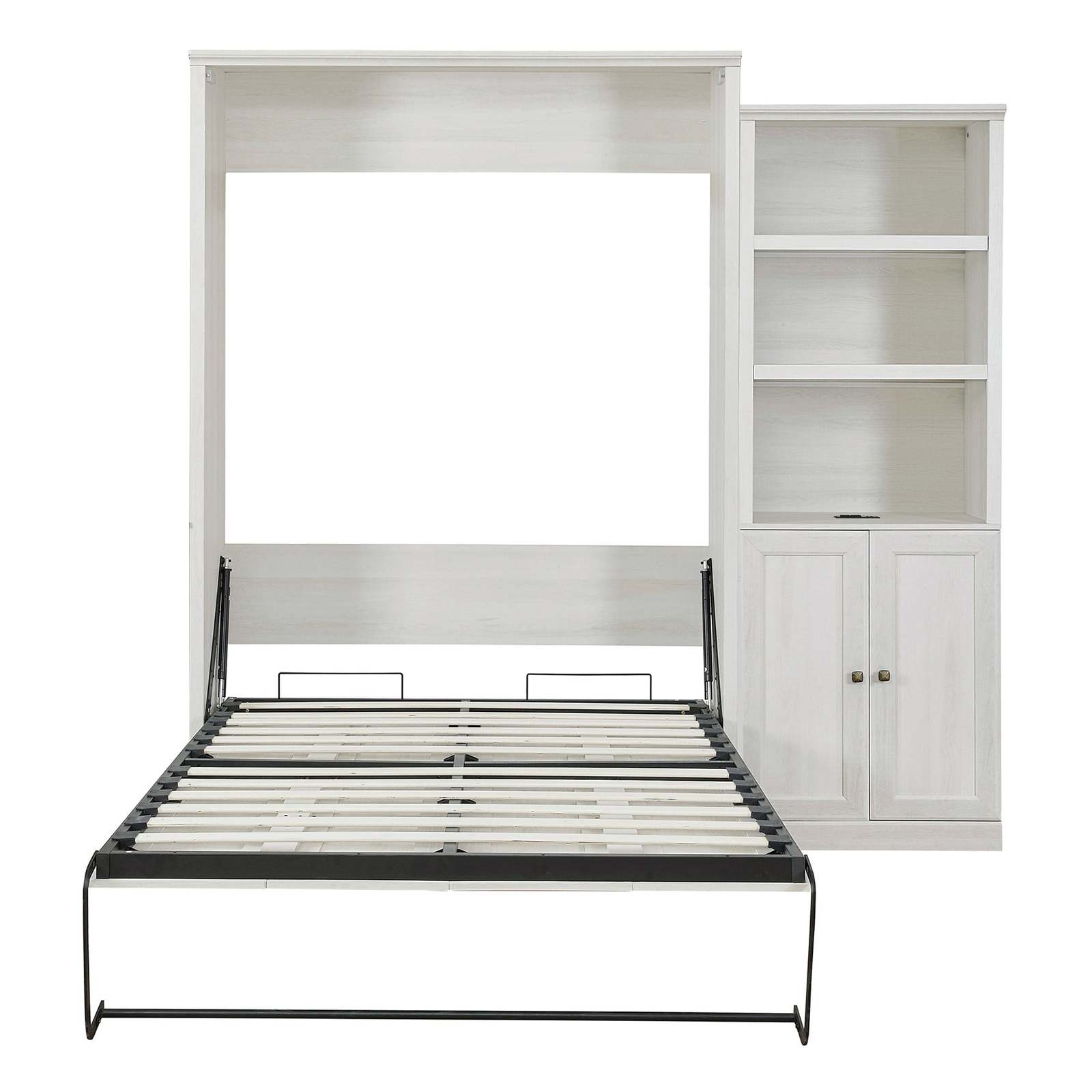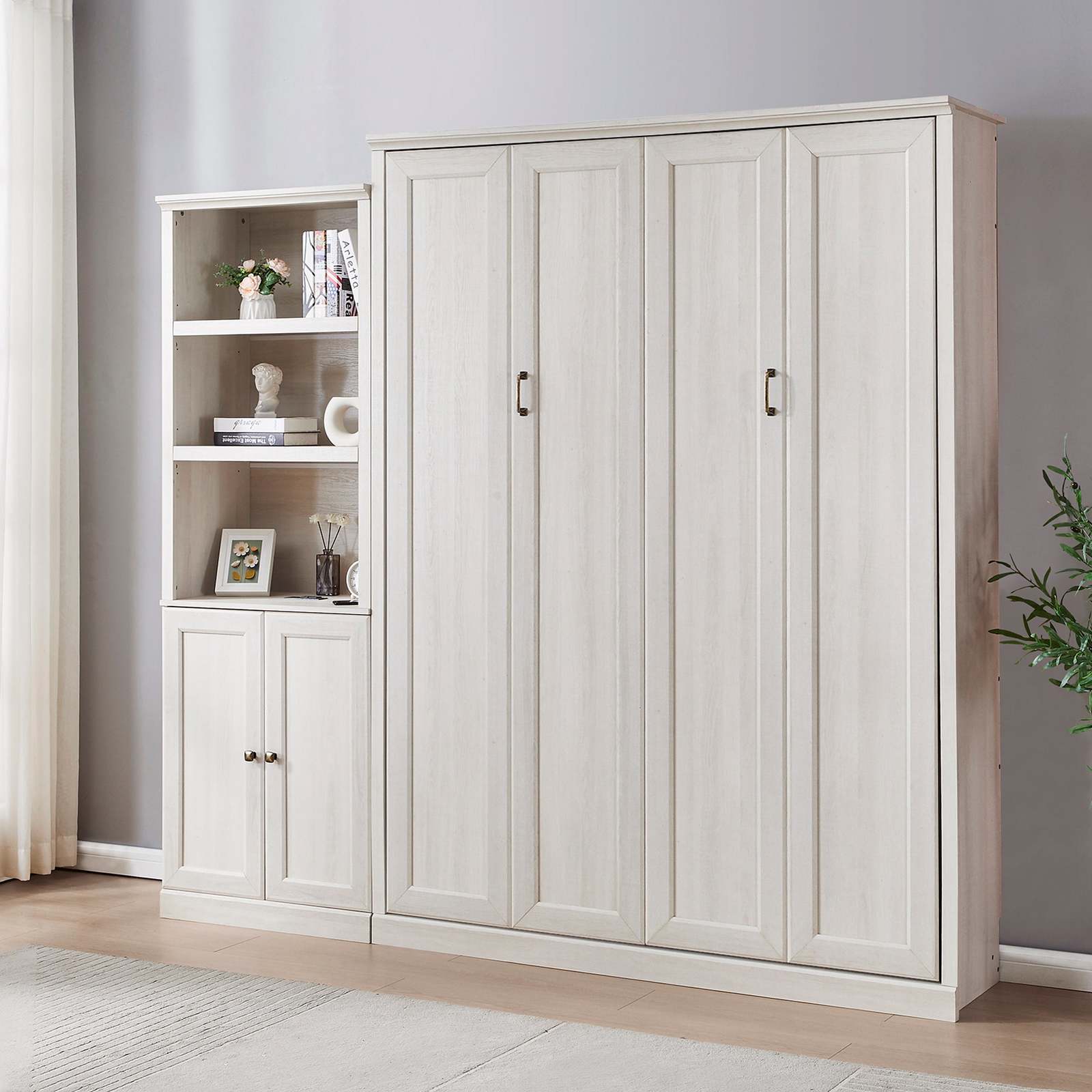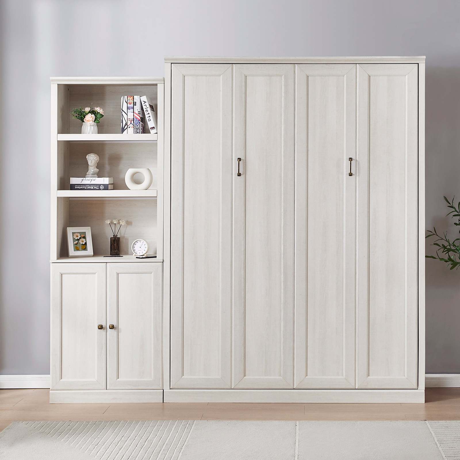 Queen Murphy Bed with Side Cabinet Storage - Space Saving Rustic White