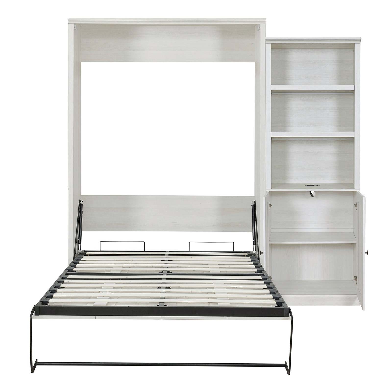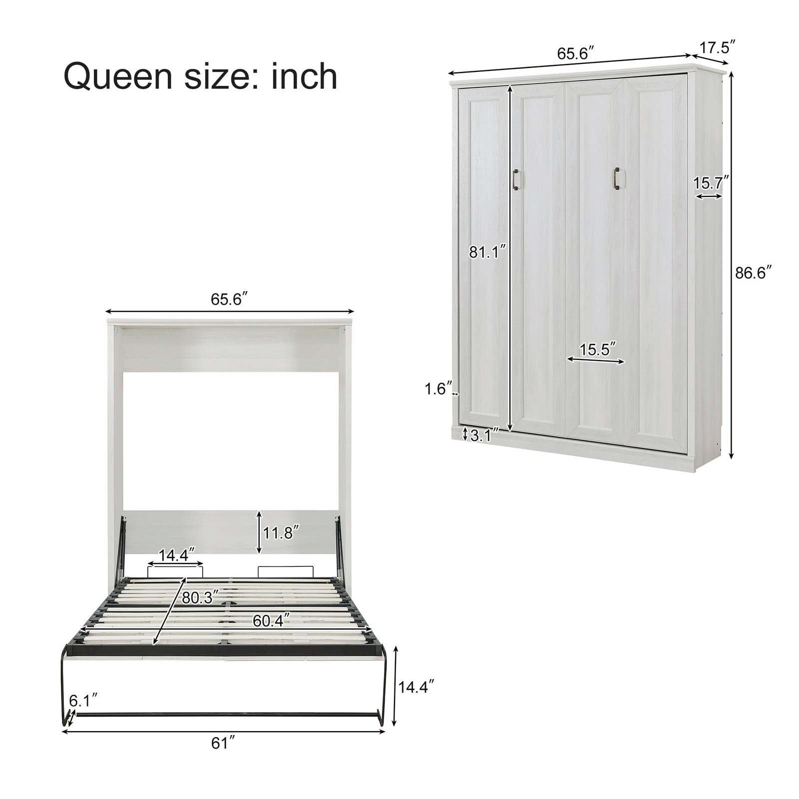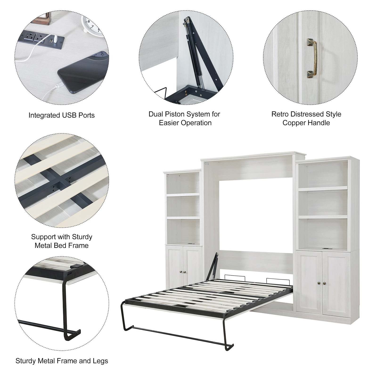 Queen Murphy Bed with Side Cabinet Storage - Space Saving Rustic White