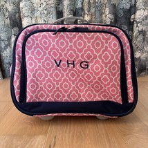 Pottery Barn Kids Pink White Blue Rolling Carry-All Travel Bag. Condition is "Pre-owned". Overall very good condition. Clean with very minimal signs of usage (a few pen type marks on the inside, scuffs on the wheels). It is monogramed with the initials "VHG" in navy.