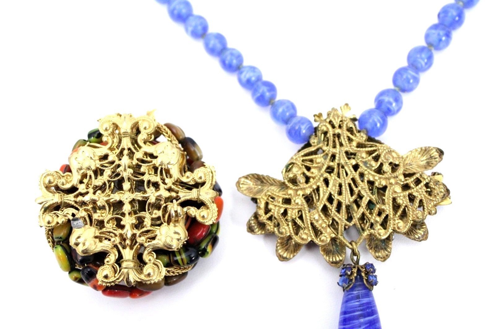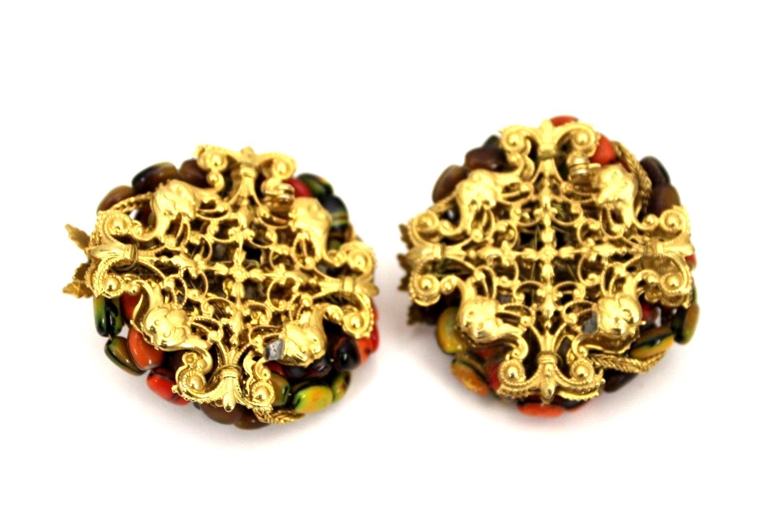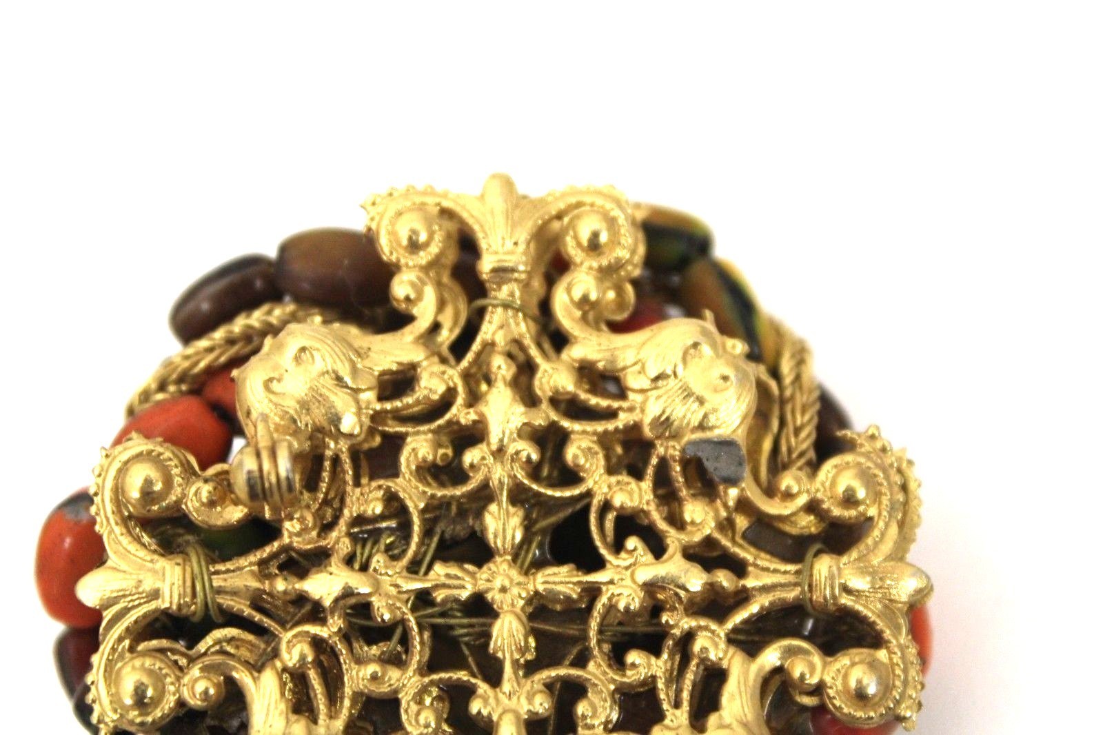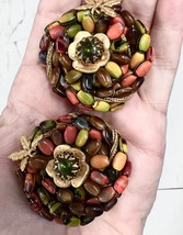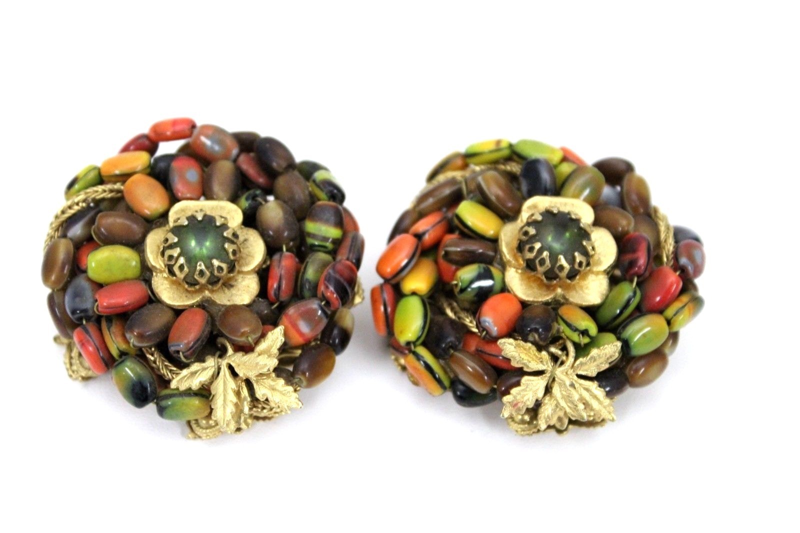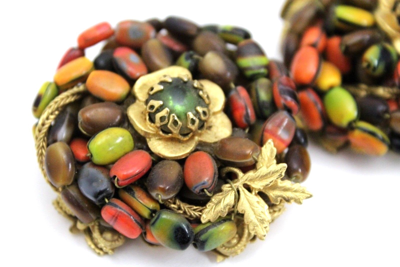 Vtg UNSIGNED Miriam Haskell Twin Brooches PINS SET 1940s Autumn Colors RARE- the tops are perfect but pins to hold them on are missing.Could repair, or use as a necklace double side fobs with beads draped, or 2 really big earrings... or buttons.