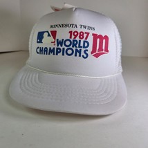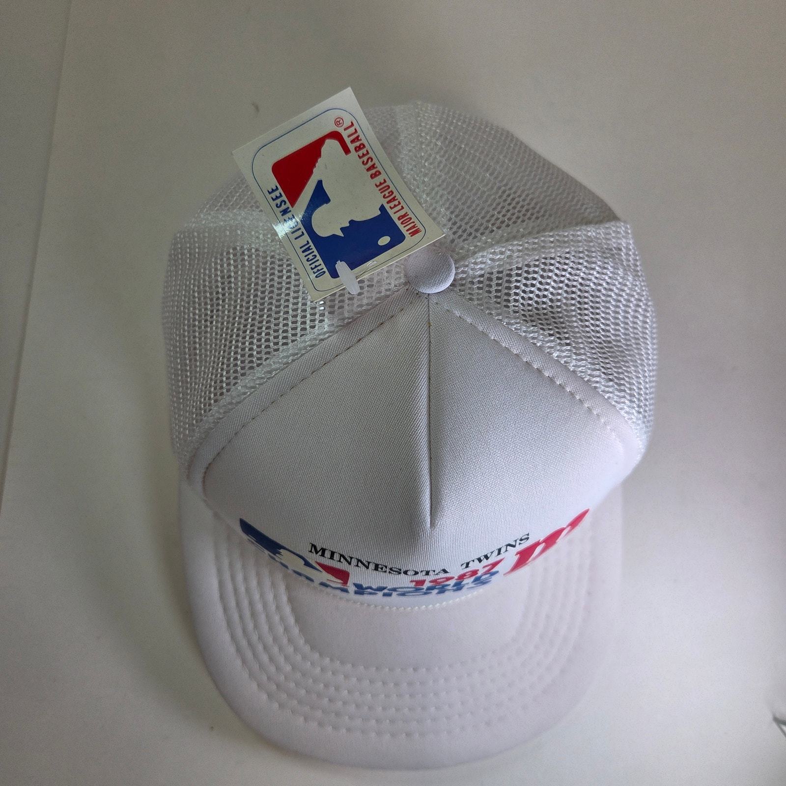 Celebrate the Minnesota Twins? historic 1987 World Series victory with this retro-style trucker cap. Features bold front graphics with the MLB logo, ?1987 World Champions,? and the Twins logo. White foam-front design with mesh back, rope accent on brim, and adjustable snapback closure. Tagged size M/L, made by NOVA/UII. Great for fans, collectors, or game-day wear.
