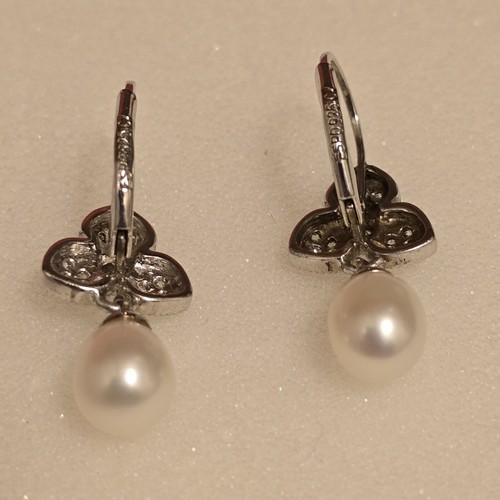 Beautiful Condition Vintage Joseph Esposito Sterling Silver Cubic Zirconia Tear Drop Pearl Earrings 1" full length.