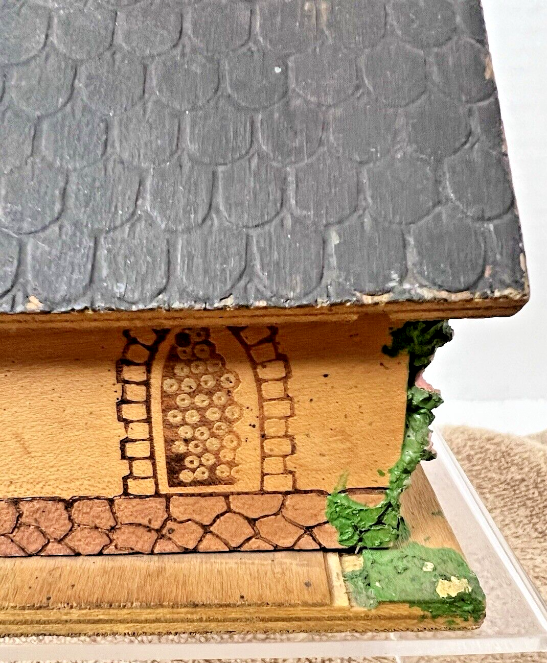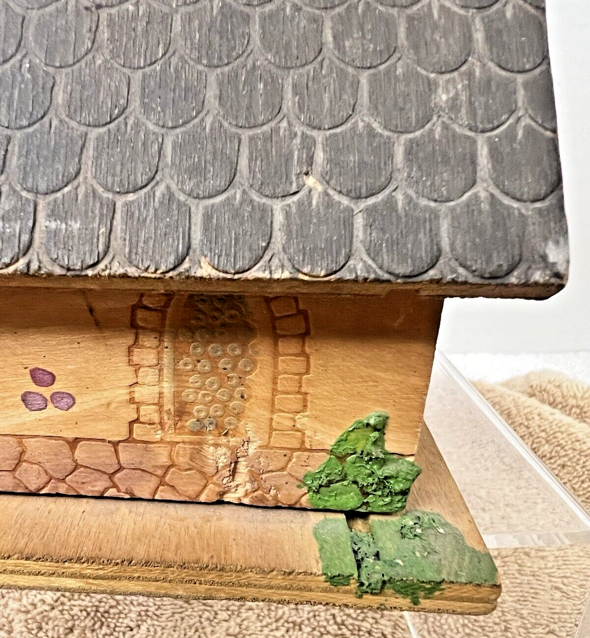 the wood has a few worn spots so see all the photos and we have not gotten it to play music but maybe there is a secret ???