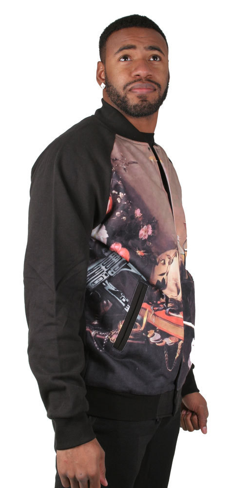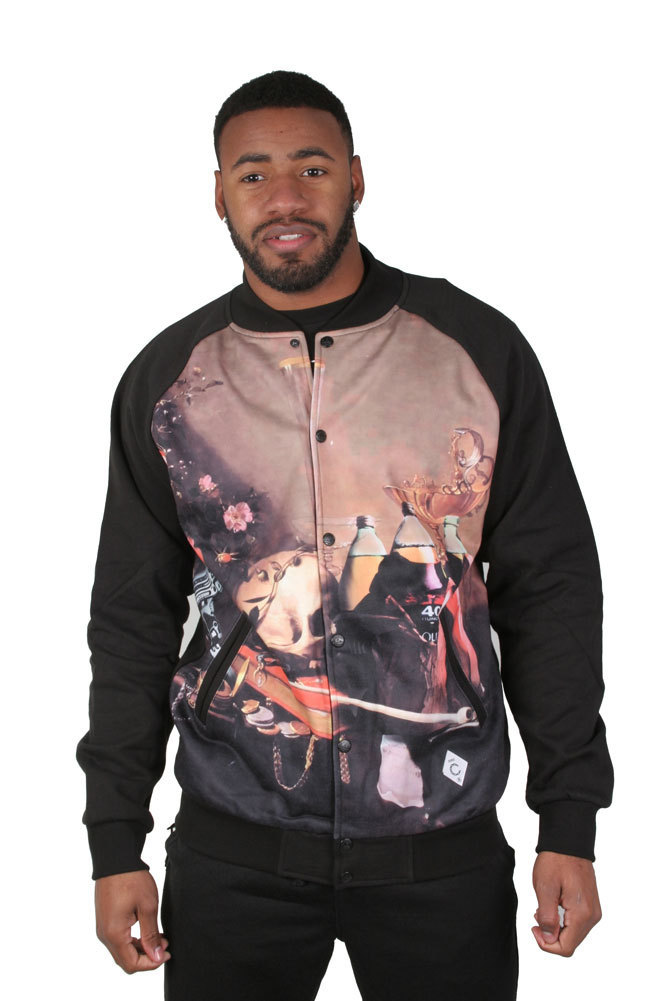 La chaqueta de beisbol Filcher Crooks Castles con un estampado de arte sublimado de mosca en el frente.